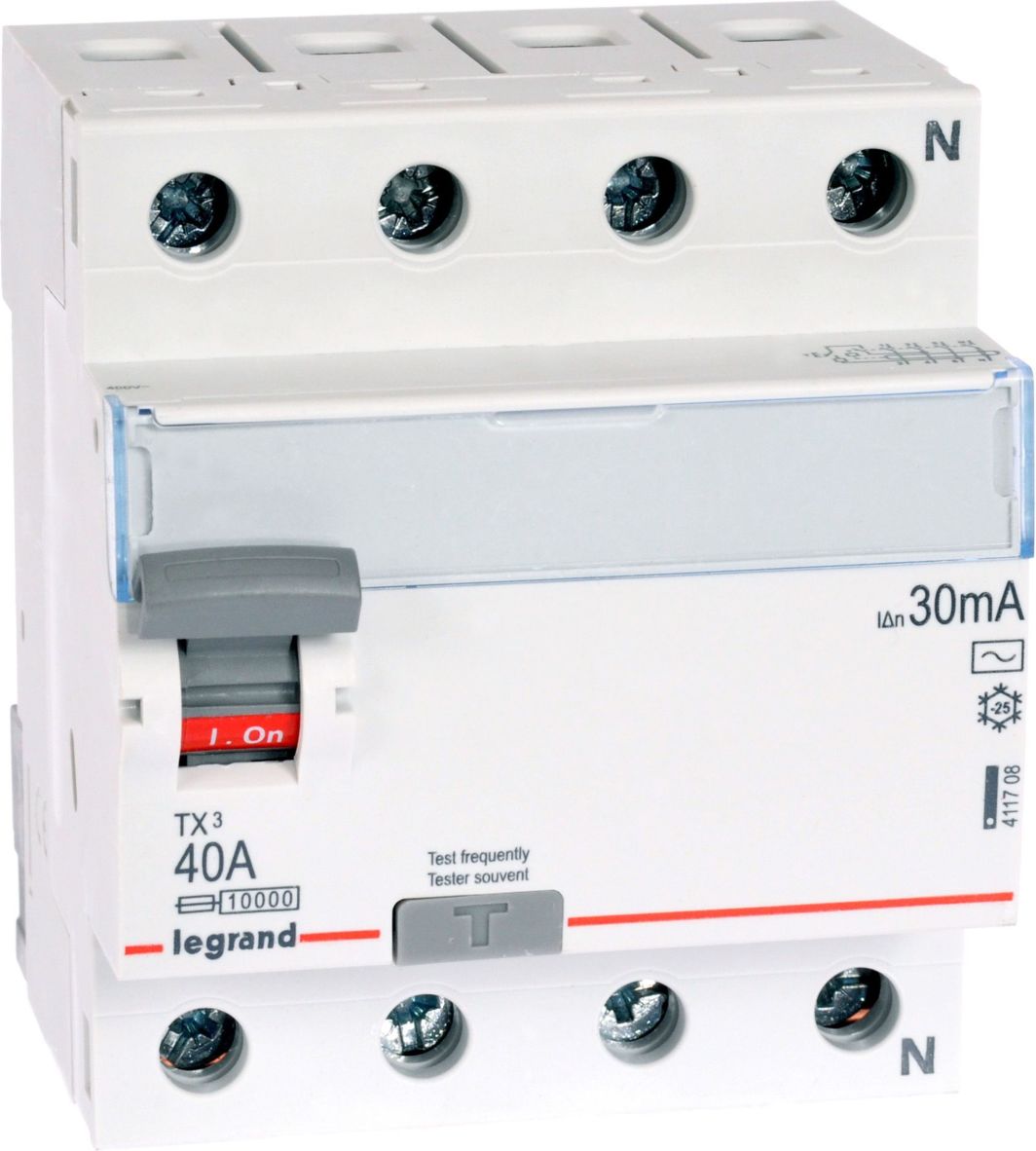 Автоматичний вимикач диференціального струму 4P 40A 0,03A типу AC P304 – 411708 чотириполюсний автоматичний вимикач 400 В типу AC: виявляє синусоїдальні змінні струми номінальний залишковий струм: 30 мА номінальний струм: 40 A ширина в модулях 17,5 мм: 4 кріплення на кронштейні TH35 можуть бути підключені за допомогою гребінчастих шин або стики можуть бути оснащені допоміжними контактами, тригерами та приводами серії DX3, сірий важіль перемикання відповідно до стандарту EN 61008-1