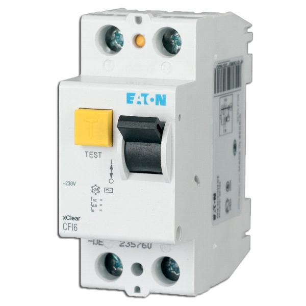Автоматичний вимикач диференційного струму CFI6-25/2/003 2-полюсний – 235753 Характеристики: спрацьовування незалежно від напруги мережі Відповідає контуру та зовнішньому вигляду серій CLS6 та CKN6 Рейкові/підйомні клеми з верхнього та нижнього боку Допоміжні контакти Z-HK та Z-NHK встановлені збоку Можна використовувати зі звичайними освітлювальними приладами з електронним запалюванням або без нього макс. 20 штук на 1 фазу 4-полюсний вимикач можна використовувати як 3-полюсний. Використовуйте клеми 1-2, 3-4, 5-6 (+ шинний міст). 4-полюсний вимикач можна використовувати як 2-полюсний. Використовуйте клеми 5-6 і N-N. Рекомендується перевіряти вимикач раз на місяць, натискаючи кнопку «Т».Після цього вимикач повинен спрацювати.Функція тестування використовується для перевірки роботи захисного вимикача залишкового струму.Це не замінить вимірювання опору заземлення RE та опору ізоляції кабелів.Технічні дані: Тип: CFI6-25/2/003 Номінальна напруга: 230 В 50 Гц Номінальний струм: 25 А Залишковий струм: 300 мА Сила короткого замикання: 6 кА Чутливість: AC Спрацьовування: миттєве Кількість полюсів: 2P Ширина: 35 мм (2 модулі) Поперечний переріз з’єднувальних кабелів: 1,5-35 мм2 Кріплення: шина TS35 мм