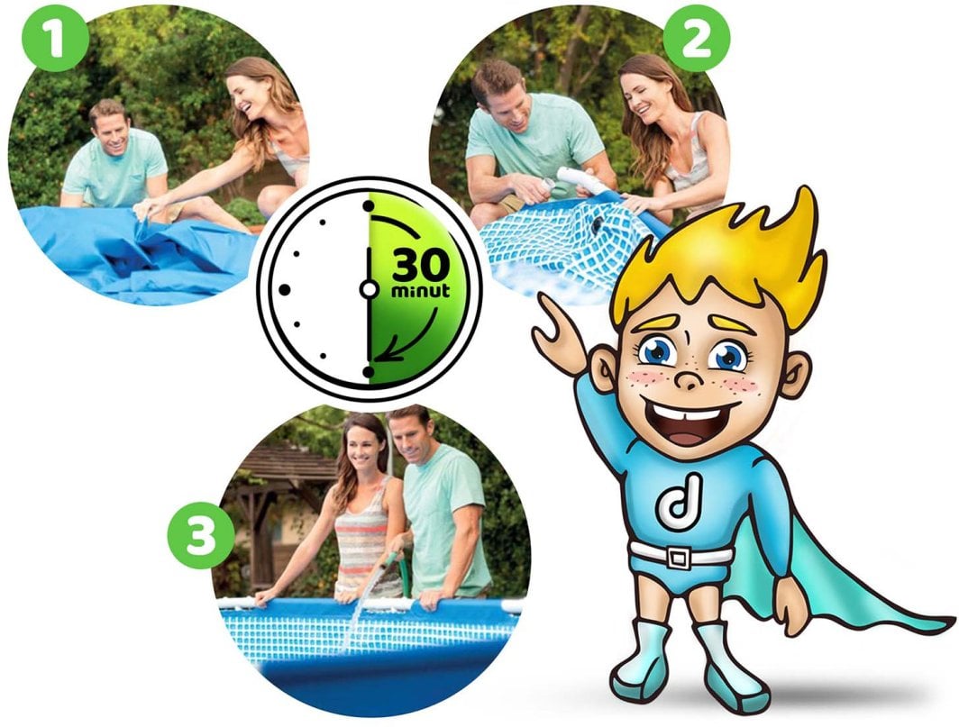 Дані Діаметр: 366 см Висота: 76 см Ємність: 6503 л Вага брутто: 30 кг Тип: рама Металевий каркас Матеріал: 3-шаровий ПВХ з високою стійкістю до проколів Рекомендоване наповнення водою: 90% Приблизний час складання: 30 хвилин Включає картриджний фільтруючий насос з витратою 2006 л/год (330 галонів) Круглий басейн Intex зі стійкою.Металевий каркас і 3-шарове вінілове покриття забезпечують стійкість і механічну міцність.Басейн в саду дозволить прийняти освіжаючу ванну або охолодитися після сонячних ванн кожного теплого літнього дня – прямо біля будинку.Басейн у власному саду – це також чудова розвага та відпочинок на природі для всієї родини.Ефективний фільтруючий насос підтримує воду чистою.Басейни Intex Широкий асортимент садових басейнів і пляжних аксесуарів дозволив Intex закріпити сильні позиції на польському та європейському ринку.Басейни Intex поділяються на два основних види: розширювальні та каркасні.Окремими категоріями можна виділити дитячі надувні рекреаційні басейни, призначені для розваг, і садові SPA басейни з гідромасажем.Кожен басейн Intex відрізняється довговічністю і стійкістю до механічних пошкоджень.Вони чудово виглядають у будь-якому саду та підходять як до класичного, так і до сучасного стилю.Розширювальний або каркасний басейн гарантує масу приємного відпочинку та веселощів для всіх домочадців.Басейни Intex з розпірною структурою виготовлені з 3-шарового ПВХ, який має підвищену стійкість до проколів і стирання.У розширювальному басейні надувається лише фланець, щоб зробити верхній край жорсткішим.Свою форму (зазвичай овальну, круглу або еліптичну) басейн набуває після наповнення водою.Розширювальні басейни характеризуються в першу чергу комфортом і простотою використання.Ви просто дістаєте їх з упаковки, кладете в обране місце, надуваєте нашийник і заливаєте водою.Залежно від моделі достатньо 30-45 хвилин, щоб басейн був готовий до використання.Каркасні басейни Intex мають зовсім іншу структуру.Раковина для басейну з 3-шарового ПВХ кріпиться на каркас з профільних труб.Завдяки каркасу басейн має стійку і міцну конструкцію.Каркасні басейни можуть мати різну форму (круглу, овальну, прямокутну), і, перш за все, вони можуть мати дуже велику місткість.Деякі моделі басейнів на каркасі Intex мають площу майже 50 м 2 і глибину понад 1,30 м. Це майже садові басейни, що пропонують багато місця для купання та водних розваг.У каркасних басейнах Intex використовується металевий каркас Ultra.Виготовляється з труб зі спеціальним перерізом, що гарантує підвищену міцність.3-шаровий матеріал 3-шаровий матеріал, структура якого забезпечує високу стійкість до проколів