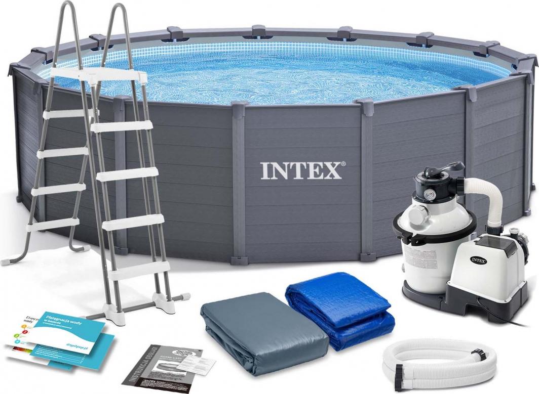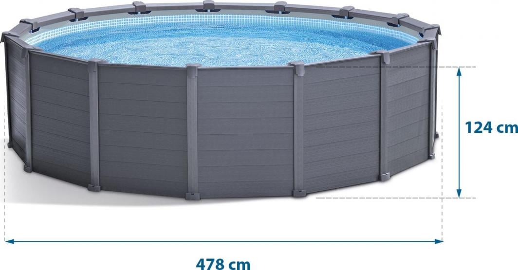 Басейн Intex Frame 478 см 11 в 1 Унікальні продукти Intex не тільки забезпечують багато розваг і відпочинку багатьом людям одночасно, але також – завдяки елегантному дерев’яному дизайну, пофарбованому в графіт – вони є ідеальною прикрасою для будь-якого саду, ідеально поєднуючись із зеленню навколишнього середовища.Міцні матеріали найвищої якості, стійкі до погодних умов і пошкоджень, гарантують, що басейн прослужить за призначенням багато сезонів, прикрашаючи сад і радуючи дітей і дорослих.Басейни цієї серії характеризуються надійністю виготовлення, безпекою та довговічністю, а також надзвичайно красивим, елегантним та природним зовнішнім виглядом, завдяки якому вони, безсумнівно, виправдають очікування навіть найвибагливіших любителів розваг та відпочинку у воді.Специфікація 3-шаровий матеріал SUPER-TOUGH®, конструкція з оцинкованої сталі, колір сірий, великий і просторий, ідеальний для всієї родини, діаметр 4,78, висота 1,24 м, вага: 235 кг, Насосний агрегат з піщаним фільтром, продуктивність 4542 л/год;килимок для басейну;накриття для басейну;двостороння драбина;посібник на DVD;час складання: 90 хв