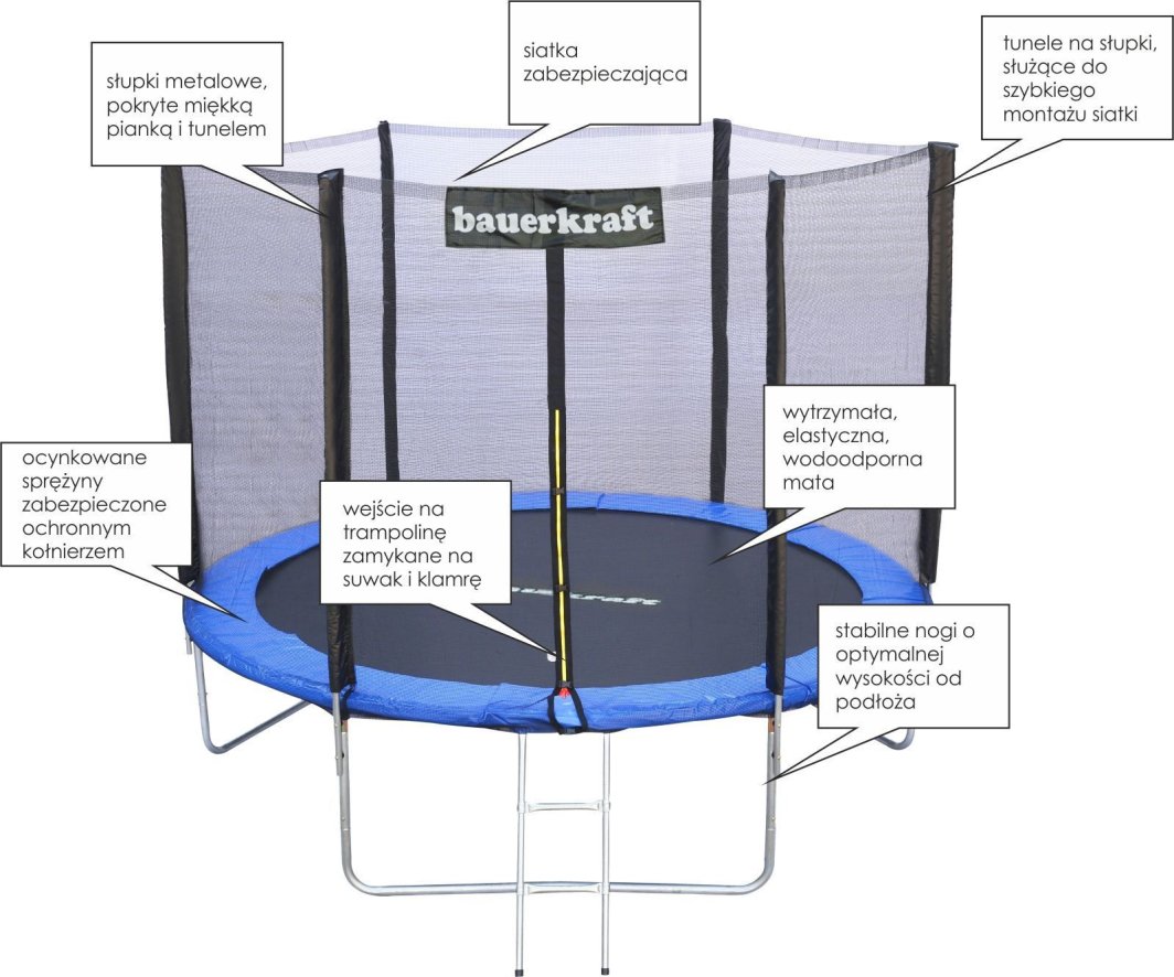 САДОВИЙ БАТУТ BAUERKRAFT З ДІАМЕТРОМ СІТКИ 244 СМ Стрибки на батуті – чудова ідея для розваг на свіжому повітрі, яка приносить радість як маленьким, так і великим користувачам.Батут – це не тільки розвага, але й хороший спосіб покращити свою фізичну форму.У комплект входить інструкція польською мовою, тому зі складанням проблем не буде.Батут встановлений на міцних, якісних сталевих пружинах, стійких до погодних умов.Внутрішній килимок, завдяки своїй надзвичайній еластичності, гарантує успішну акробатику.Наш продукт, завдяки високій якості виготовлення, абсолютно безпечний.Батут являє собою міцну посилену конструкцію на трьох ніжках, виготовлених з високоякісного матеріалу, оточених сіткою.Міцність конструкції до 100 кг!Висока рама забезпечує комфорт і безпеку гри.Ви можете вільно виконувати різноманітні види акробатики на батуті, не турбуючись про його міцність.ПЕРЕВАГИ: 3 опори з оцинкованої сталі, гарантують міцність і стабільність, захисна сітка, що забезпечує безпеку під час стрибків, велика і міцна драбина, міцний і міцний килимок для стрибків, подвійне кріплення – замок і пряжка, міцні пружини СПЕЦИФІКАЦІЯ: діаметр батута: 244 см (8 футів) висота з сіткою: 205 см Тип сітки: зовнішня кількість ніжок: 3 конструкція: загартована сталь, оцинкована кількість сітчастих опор: 6 максимальна вага користувача: 100 кг вага батута: приблизно 34,5 кг Через розмір виробу він упакований у 2 упаковки.Розмір упаковки: 131 x 16 x 56 см (26,5 кг) 100 x 12 x 32 см (8 кг)