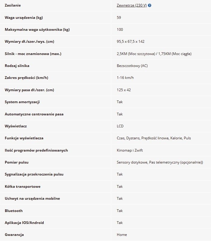 Електрична бігова доріжка Runner DS Fitness AppReady – ваш партнер у домашніх тренуваннях. Електрична бігова доріжка Runner DS Fitness AppReady – ідеальне рішення для тих, хто хоче вести активний спосіб життя в комфортних домашніх умовах.Завдяки сучасним функціям ця бігова доріжка підтримує користувачів у досягненні фітнес-цілей, забезпечуючи комфорт і ефективність тренувань.Розміри та конструкція бігової доріжки Бігова доріжка має розміри 153,5 x 67,5 x 142 см у розкладеному стані, що гарантує стабільність під час використання.У складеному вигляді його розміри становлять 95,5 х 67,5 х 142 см, що полегшує його зберігання.Вага пристрою становить 59 кг, що робить його солідним, але в той же час мобільним пристроєм.Регулювання кута нахилу та швидкості Runner DS Fitness AppReady пропонує можливість регулювати швидкість від 1 до 16 км/год і кут нахилу до 12%.Завдяки цьому користувачі можуть легко регулювати інтенсивність навчання відповідно до своїх індивідуальних потреб і рівня просування.Програми тренувань і функції моніторингу Бігова доріжка оснащена 36 програмами тренувань, що дозволяє різноманітність вправ.Користувачі можуть відстежувати тривалість тренування, відстань, частоту серцевих скорочень і спалені калорії, забезпечуючи ефективний моніторинг прогресу.Зручні додаткові функції: Bluetooth і тримач для пляшки з водою Оснащена системою Bluetooth, бігова доріжка дозволяє підключатися до програм для тренувань, таких як Zwift App і Kinomap.Крім того, бігова доріжка має тримач для пляшки з водою, який забезпечує легкий доступ до напоїв під час тренування.Система складання та транспортування бігової доріжки Система Soft Drop полегшує розкладання та складання бігової доріжки, що робить її ідеальним рішенням для домашнього використання.Це дозволяє користувачам легко зберігати обладнання, коли воно не використовується.Вага та максимальне навантаження користувача Максимальне навантаження користувача становить 100 кг, що робить бігову доріжку придатною для широкого кола користувачів.Його міцна конструкція забезпечує безпеку та комфорт під час тренувань.Технічні характеристики бігової доріжки Runner DS Fitness AppReady Модель: AppReady Бренд: DS Тип: електричний Вимірювання: тривалість тренування, дистанція, пульс, витрачені калорії Додаткові характеристики: Bluetooth, клавіші швидкого доступу, ключ безпеки, місце для пляшки з водою, складна, програми тренувань, регулювання кута нахилу Максимальна вага користувача: 100 кг Кількість програм тренувань: 36 Потужність: 2,50 HP (пікова потужність), 1,75 HP (постійна потужність) Швидкість: 1-16 км/год Кут нахилу: 12% Ширина стрічки: 42,00 см Довжина стрічки: 125,00 см Ширина виробу в розкладеному стані: 67,50 см Довжина виробу в розкладеному стані: 153,50 см Висота виробу в розкладеному стані: 142,00 см Вага виробу: 59,00 кг Вага виробу з індивідуальною упаковкою: 65,00 кг Замовляйте зараз, щоб насолоджуватися найкращими тренуваннями вдома!