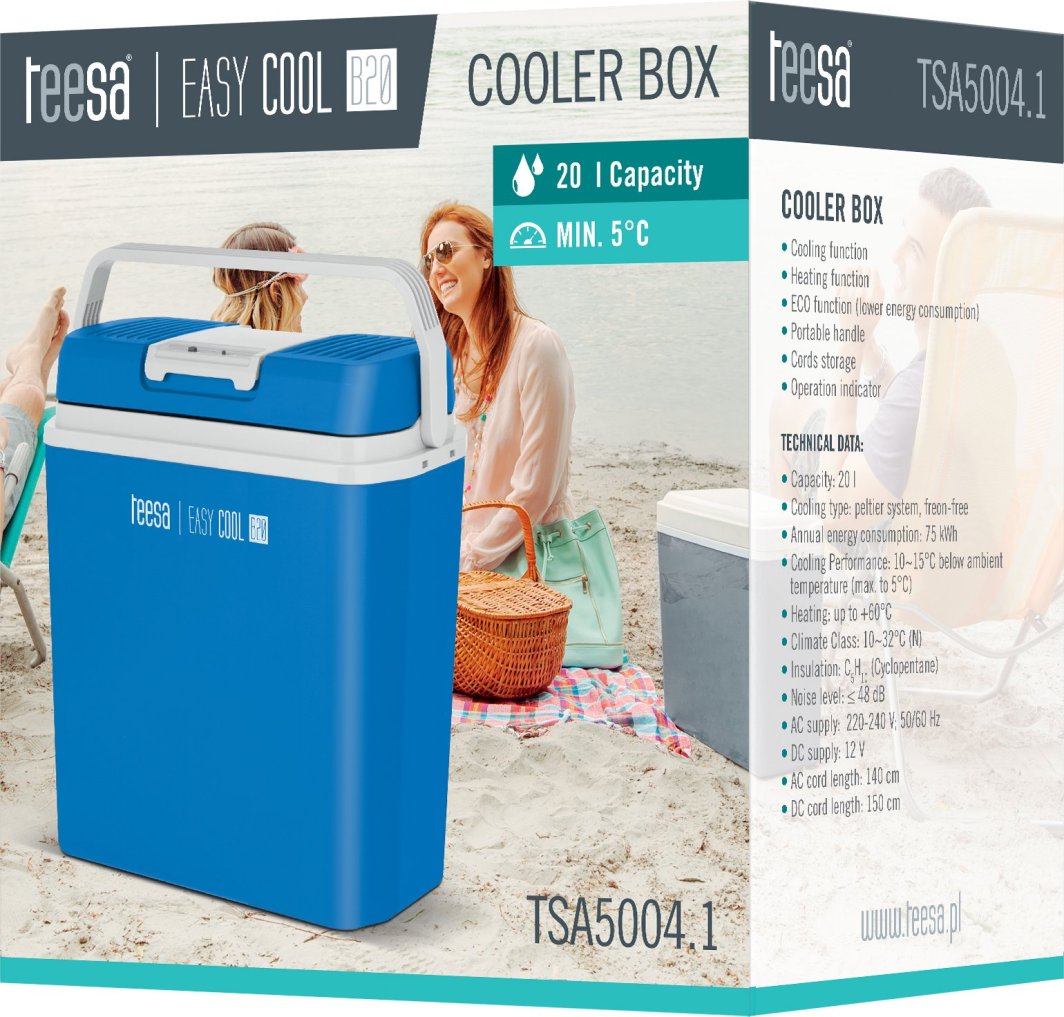 Для будь-якої погоди Дорожній кулер Teesa – ідеальний продукт як для спекотних літніх днів, так і для зимових подорожей.Дозволяє, залежно від зовнішніх умов, охолоджувати їжу до 5°C або розігрівати до +60°C.Тому це ідеальний пристрій для охолодження їжі під час літнього пікніка чи кемпінгу, а також для зберігання гарячих напоїв під час зимових розваг.Використовуйте, де завгодно. Цей компактний холодильник оснащений роз’ємами, які дозволяють підключати його як до автомобільного прикурювача, так і до звичайної розетки.Завдяки цьому, незалежно від того, подорожуєте ви автомобілем, таборуєте у віддаленій місцевості чи зупиняєтесь у готелі, ви можете зберігати харчові продукти у відповідних умовах.Компактний дорожній холодильник 20-літровий внутрішній простір робить дорожній холодильник Teesa ідеальним для зберігання продуктів і напоїв під час подорожей або коротких подорожей.Його компактні розміри дозволяють легко розмістити його в багажнику автомобіля, невеликому кемпінгу або в обмеженому просторі в готельному номері.Надійний компаньйон у подорожах Дорожній холодильник TSA5004.1 характеризується надійною обробкою, що забезпечує довговічність і стійкість до зовнішніх умов, характерних для подорожей.Дуже міцну конструкцію пристрою доповнює естетичний корпус модного синього відтінку.