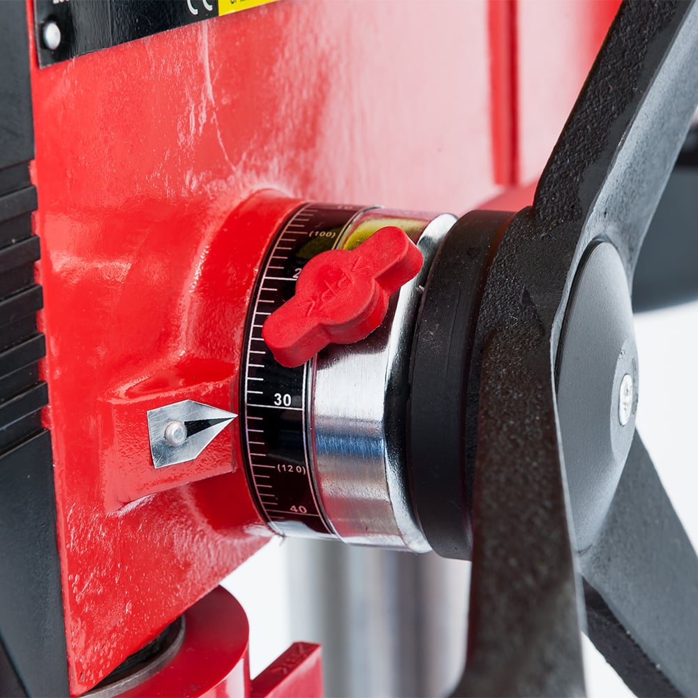 Стовпна дриль потужністю 550 Вт (77316) Характеристики: Робочий стіл і основа з литої сталі Запобіжний перемикач усередині ремінної коробки передач Зубчаста система регулювання висоти столу Лазерна указка (в окремих моделях) Передній перемикач дриля Налаштування глибини свердління Нахил столу +/- 45° Пластикова кришка для свердла Можливість прикріпити лещата Литі алюмінієві шківи Легке регулювання клинові ремені Технічні дані: Двигун потужність: Джерело живлення: 230V / 50Hz / 1Ph Діаметр: колони 72 мм Макс. діаметр ручки: 16 мм Регулювання ручки: 3 – 16 мм Подача шпинделя: 80 мм Кількість швидкостей: 16 Оберти: 180, 270, 310, 420, 430, 470, 580, 630, 650, 720, 1230, 1320, 1460, 1880, 1950, 2770 об/хв Кріплення патрона: MTII Відстань від шпинделя до колони: 162,5 мм Відстань від шпинделя до столу: 450 мм Відстань від шпинделя до основи: 630 мм Розмір столу: 250 x 250 мм Розмір основи: 250 x 420 мм Вага: 42 кг