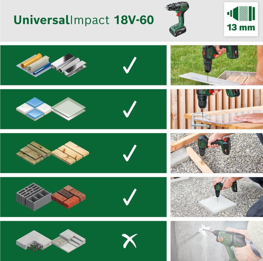 Ударний дриль/шуруповерт UniversalImpact 18V-60 Ефективне загвинчування та ударне свердління в поєднанні з максимальним робочим часом і високим комфортом. Безщітковий двигун забезпечує вищу ефективність свердління та довший робочий час. Міцний металевий патрон діаметром 13 мм забезпечує надійне кріплення дрилі та легку заміну аксесуарів. Оптимальний контроль завдяки можливості вибору одного з 20 діапазонів крутного моменту та максимального крутного моменту під час сильного загвинчування, який становить 60 Нм. 2-швидкісна передача, режим свердління та ударного свердління Легке загвинчування та ударне свердління в стінах, дереві, металі та пластмасі Технологія Syneon забезпечує оптимальну потужність або максимальний робочий час залежно від потреб ЖИВЛЕННЯ 18 В ДЛЯ ВСІХ – акумулятор для всіх електроінструментів 18 В із пропозиції Home & Garden Багатофункціональний електроінструмент, що забезпечує високу ефективність при ударному свердлінні та загвинчуванні Виконуйте численні проекти без зусиль із вражаючою продуктивністю та довгою час роботи UniversalImpact 18V-60.Цей легкий і універсальний електроінструмент пропонує 20 діапазонів крутного моменту, 2-швидкісну коробку передач і режим перфоратора, що дає вам більшу гнучкість і контроль під час роботи.Надзвичайна продуктивність цього електроінструменту базується на технології безщіткових двигунів Bosch: інструмент швидко та плавно закручує шурупи та свердла в дерев’яних балках, металі та цегляній кладці, забезпечуючи більший комфорт роботи.Користувачі оцінять міцний металевий тримач діаметром 13 мм, який забезпечує надійне кріплення свердел і шуруповертів.Інструмент є частиною POWER FOR ALL ALLIANCE.Одна батарея може використовуватися для живлення багатьох інструментів різних марок.Характеристики та переваги UniversalImpact 18V-60 POWER FOR ALL – для всіх акумуляторних систем Bosch Для свердління, чищення чи садівництва.Акумулятор Bosch POWER FOR ALL 18 В можна використовувати в різноманітних інструментах, забезпечуючи швидку та легку роботу.Щоб ще більше підвищити робочу гнучкість, акумулятор також сумісний з інструментами інших партнерів POWER FOR ALL.Довговічність і потужність Безщітковий двигун поєднує в собі значно довший термін служби з більшою потужністю.З електронним керуванням, він зменшує виділення тепла, не має елементів тертя або зношуваних елементів і працює з максимальною ефективністю, а його компактна конструкція робить інструмент легшим і зручнішим у використанні.Металевий патрон Безінструментальний патрон дозволяє швидко змінювати аксесуари однією рукою та забезпечує високу силу затиску свердел у патроні.Метал, з якого виготовлена ​​рукоятка, відрізняється більшою міцністю і надійністю і ефективно запобігає розбовтування свердла в рукоятці.Діапазон затиску тримача 2–13 мм.Легка точна робота 20 діапазонів крутного моменту забезпечують максимальну точність: просто виберіть потрібний крутний момент на циферблаті та відрегулюйте його відповідно до властивостей матеріалу, що обробляється.Після встановлення максимальний вибраний крутний момент забезпечує оптимальну потужність.Світлодіодний ліхтар для оптимальної видимості Вбудований світлодіодний ліхтар забезпечує оптимальну видимість під час свердління та загвинчування за несприятливих умов освітлення.Дві передачі забезпечують рівномірну т