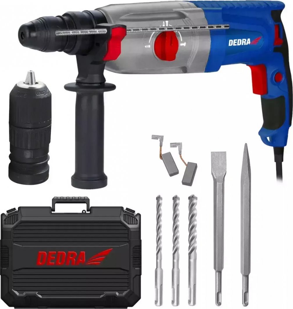 Ударний дриль Dedra DED7852QC Ударний дриль DED7852QC використовується для ударного свердління бетону, залізобетону та інших будівельних матеріалів.Він також призначений для більш легких робіт, пов’язаних з взуттям.3 режими роботи дозволяють використовувати цей пристрій також для свердління таких матеріалів, як дерево або метал.Все упаковано в функціональну валізу з аксесуарами, які дозволяють працювати відразу після розпакування.Набір доповнюється додатковим самозажимним патроном, що дозволяє використовувати стандартні свердла по дереву та металу з циліндричним патроном.Завдяки спеціальній конструкції зміна патрона SDS+ на свердлильний патрон відбувається дуже швидко.Характеристики: SDS + 3 патрона Режими роботи: свердління, ударне свердління, довбання Прогумована рукоятка Швидка заміна держаків свердел Технічні дані: Напруга: 230 В / 50 Гц Потужність: 1050 Вт Енергія удару: 3,6 Дж Швидкість обертання: 0-980 об/хв Кількість ударів: 0-5300 об/хв Тип монтажної головки: SDS + Додатковий свердлильний патрон: самозатискний, 2-13 мм Максимальний діаметр свердління в дереві: 30 мм Максимальний діаметр свердління в металі: 13 мм Максимальний діаметр свердління в бетоні: 30 мм Вага: 3,7 кг Обладнання: Загострене долото Плоске долото 3 свердла по бетону Самозажимний свердлильний патрон Додаткова ручка Транспортний кейс Запасні електрографітні щітки