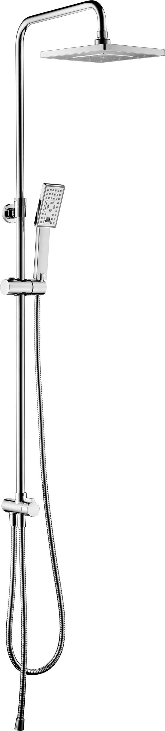 для установки з будь-яким накладним змішувачем для душу або ванни, душова колонка з перемикачем (UNI UN10041): кронштейн для монтажу тропічного душу, відстань монтажних кронштейнів: 73,2 см, відстань кронштейна від стіни: ~35 см, тропічний душ 20 x 20 см (JIMJIM WG), 3-функціональна душова ручка (JIMJIM-R), струмені води: дощ, турбо, масаж, шланг латунний душ 150 см, з’єднувальний шланг для душового змішувача, загальна висота системи: 87,2 – 114,2 см (регульована), поворотний кронштейн