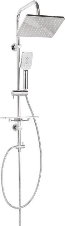Хромований тропічний душ Nyks (AU-32-001) Технічні характеристики: Посувна ручка, що регулюється кнопкою – забезпечує комфорт використання Регульовані монтажні кронштейни Джерело душу вибирається ручним перемикачем Колір: хром У комплекті: Душова колонка з нержавіючої сталі, висота 96 см. Верхній душ 26 x 19 см, антинакипний, рухомий 3-функціональний ручний душ (звичайний струмінь, гідромасаж, змішаний), перемикач функцій в ручці трубки, антинакип Сталевий душовий шланг, подвійне плетіння, 150 см Шланг для підключення змішувача, сталь, подвійне плетіння, 50 см Функціональна полиця для косметики з тримачем для трубки