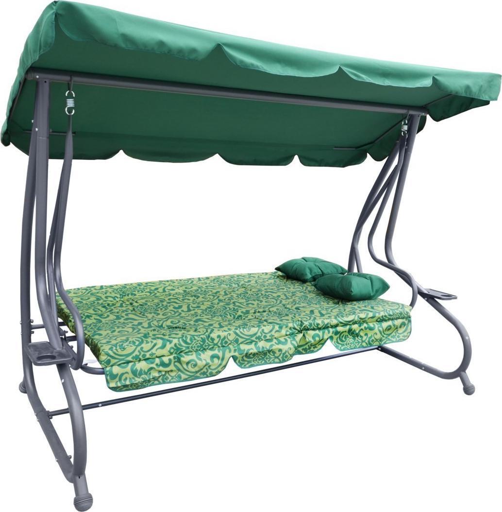 Опис Садові гойдалки з відкидним сидінням і регульованим навісом, зелені з візерунком [8011 PATTERN Z] Сидіння виготовлено з матеріалу Textiline з переплетенням 2х1. Матеріал, з якого виготовлена ​​сітка, – поліефірна пряжа, покрита вінілом.Textiline призначений для зовнішнього використання завдяки високій стійкості до суворих погодних умов.Сітка надзвичайно гнучка і стійка до розтягування, що додатково впливає на комфорт використання, а сам матеріал не деформується.2 стьобані подушки та матрац для сидіння (губка для оббивки 10 см), багатоступінчасте, плавне регулювання купалу, чохол на балдахін з поліестеру щільністю 180 г, зручне розкладне сидіння, яке можна використовувати як для сидіння, так і для лежання, 2 підставки для напоїв, кріплення гойдалок на пружинах, конструкція зі сталі з порошковим покриттям, якісні зварні шви, висока стійкість до погодних умов, масивна нековзна гума на кінцях ніжок, дуже легко підтримувати в чистоті, чохол на сидіння з поліестеру вагою 160 г, максимальне навантаження 300 кг., Розміри Зовнішні розміри ширина прибл. 214 см, глибина бл. 114 см, висота плафону в центральній частині бл. 168 см, вага прибл. 39 кг, висота спинки сидіння без матраца прибл. 50 см, глибина сидіння без матраца бл. 48 см, довжина сидіння без рами прибл. 185 см, ширина сидіння в розкладеному вигляді прибл. 100 см, довжина купола прибл. 220 см, ширина бл. 117 см, довжина матраца прибл. 180 см, сидіння бл. 48 см, спинка прибл. 51 см, ширина в розкладеному вигляді прибл. 101 см, розмір упаковки 207 х 57 х 30 см, вага 41 кг, товщина трубок для ніжок рами 48 х 1,1 мм, верхньої рами 48 х 1,1 мм, рами сидіння 32 х 1,2 мм, посилення гойдалок 25 х 0,8 мм, рами сидіння 28 х 1,5 мм, рами навісу 16 х 0,6 мм,