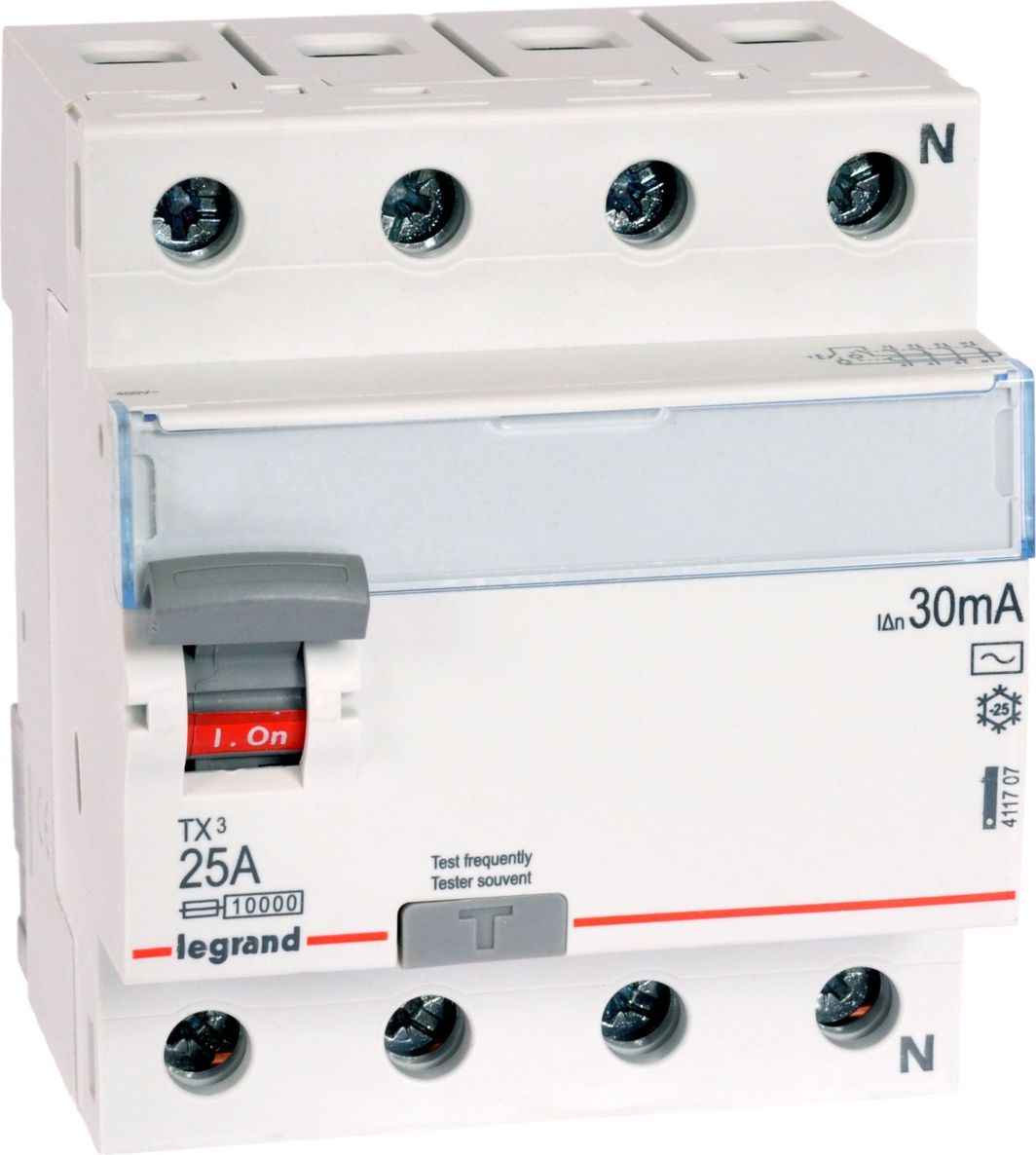 Автоматичний вимикач 4P 25A 0,03A типу AC P304 – 411707 чотириполюсний автоматичний вимикач 400 В типу AC: визначає синусоїдальні змінні струми номінальний залишковий струм: 30 мА номінальний струм: 25 A ширина в модулях 17,5 мм: 4 монтажні на кронштейні TH35 можуть бути підключені за допомогою гребінчастих шин або стики можуть бути оснащені допоміжними контактами, тригерами та приводами серії DX3, сірий важіль перемикання відповідно до стандарту EN 61008-1