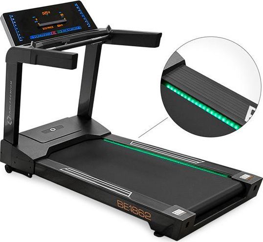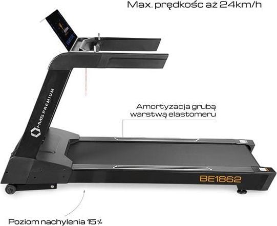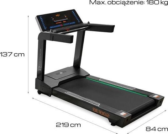 Електрична бігова доріжка BE1862 від HMS Premium – це обладнання, яке добре працює як вдома, так і у фітнес-клубах.Міцна конструкція бігової доріжки, готова до навантажень до 180 кг, дозволяє проводити інтенсивні кардіотренування.Амортизований біговий ремінь означає, що ні суглоби, ні хребет не постраждають від тривалого тренування.Великі розміри бігової доріжки роблять тренування комфортними для всіх, незалежно від зросту і ваги.Ключ безпеки дозволяє негайно зупинити бігову доріжку в разі надзвичайної ситуації.Інтуїтивно зрозуміла панель зі світлодіодним дисплеєм дозволяє легко вибрати швидкість і кут нахилу або програму тренувань, яка підходить саме вам.Бігова доріжка BE1862 дозволяє бігати зі швидкістю від 0,5 до 24 кілометрів на годину.Можна бігати по рівній поверхні або встановити кут нахилу максимум 15%. привід: електродвигун: номінальна потужність: 3,0 к. с.пікова потужність: 6,0 к. с. діапазон швидкості: 0,5-24 км/год діапазон кута нахилу: 0-15% кнопки швидкої зміни швидкості (4, 6, 8, 10, 12, 14, 16, 18) кнопки швидкого зміни кута нахилу (0, 2, 4, 6, 8, 10, 12, 14) – 8 значень автоматичне регулювання швидкості та кута нахилу амортизація вимірювання частоти серцевих скорочень: сенсорні датчики телеметричний ремінь (опція) живлення: 230В тримач пляшки з водою тримач для мобільних пристроїв транспортувальні ролики система безпеки бортовий комп’ютер світлодіодний сенсорний дисплей зчитування: часу, швидкості, дистанції, пульсу, калорій, жиру максимальна вага користувача: 180 кг розміри бігового полотна: 56×157 см розміри: 219x84x137см навчальні програми: 30 20 постійних 4 можливості налаштування власних програм 2 програми HRC Програма THR “низька швидкість” Програма “охолодження” Програма ручна програма (кожен параметр контролюється користувачем)
