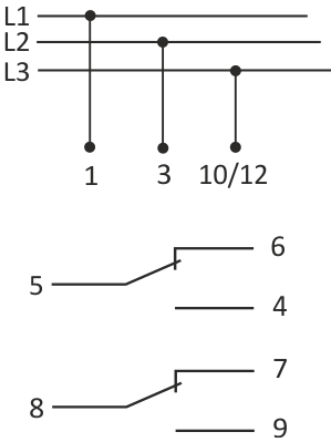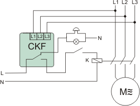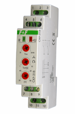 Датчики послідовності та втрати фаз – CKF-318 Призначення Датчик послідовності та втрати фаз CKF-318 призначений для захисту електродвигунів, що живляться від трифазної мережі 3×400 В (без нульового проводу).Реалізовані функції захисту: – несиметрія напруги між фазами – повна втрата фази – симетричне падіння напруги в трьох фазах – зміна послідовності фаз – перевищення верхнього порогу фазної напруги >480В – перевищення нижнього порогу фазної напруги <320В Робота При правильних умовах напруги в мережі контакти датчика замкнуті.При виникненні аномалій напруги датчик відключає контакти з відповідною затримкою часу.Повернення параметрів мережі до нормальних умов призведе до повторного включення контактів із встановленою затримкою.Сигналізація: зелений світлодіод [R]: - горить - правильні параметри, контакт замкнутий - блимає - зворотний відлік затримки перезапуску світлодіод червоний [ - горить - асиметрія напруги або напруга нижче 320 В - блимає × 1/с - неправильна послідовність фаз - блимає × 3/с - напруга вище 480 В Технічні дані Джерело живлення 3 × 400 контактів 2 × розділених 1 × НО/НЗ струм навантаження <10 A контроль живлення 2× LED асиметрія напруги активації 20÷80V~ min/max напруга активації <320V~ / >480V~ гістерезис напруги 5V~ затримка вимкнення.з асиметрією 1÷10 с, затримка перезапуску з асиметрією та відмовою 2÷360 с час активації для мінімальних/максимальних напруг 5 с / 0,5 с споживана потужність 1,6 Вт підключення 2,5 мм² гвинтові клеми робоча температура -25÷40°C розміри 1 модуль (18 мм) монтаж на рейку TH-35 мм рівень захисту IP20