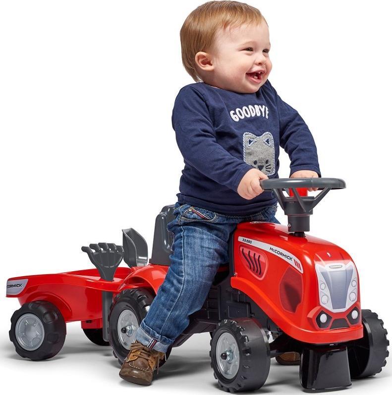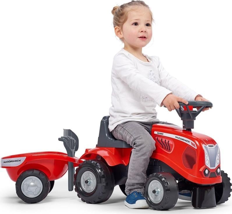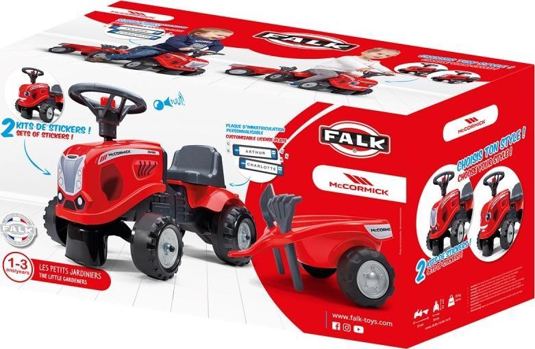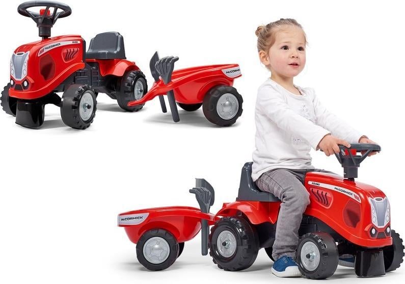 Baby Mac Cormick Ride On Tractor з причепом – мрія багатьох маленьких трактористів.Зроблено акуратно, з увагою до найменших деталей!Жоден справжній фермер не зневажав би таким.Транспорт виготовлений з матеріалів найвищої якості і призначений для дітей від 12 місяців.Автомобіль оснащений знімним причепом з панелями та рульовим колесом з звуковим сигналом.Колеса трактора виготовлені з високоякісного пластику.Окрім трактора, у нас є граблі та лопата, якими наша дитина може погратися.Трактор має: – клаксон в кермі, – відчіпний причіп – від 12 місяців, – керований передній міст, – колеса з якісного пластику, – стійкі та безпечні, – максимальне навантаження 25 кг.- продукт для часткового складання, – граблі та лопата в комплекті.Falk є провідним європейським виробником високоякісних педальних автомобілів.У пропозиції компанії є трактори ліцензованих брендів Claas, Renault, McCormick, Kubota, Case IH та інших.Всі автомобілі виробляються у Франції з високоякісних матеріалів.