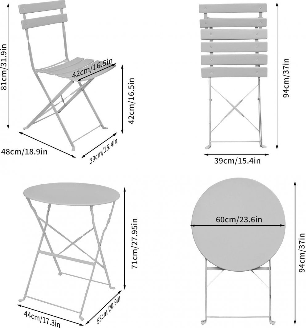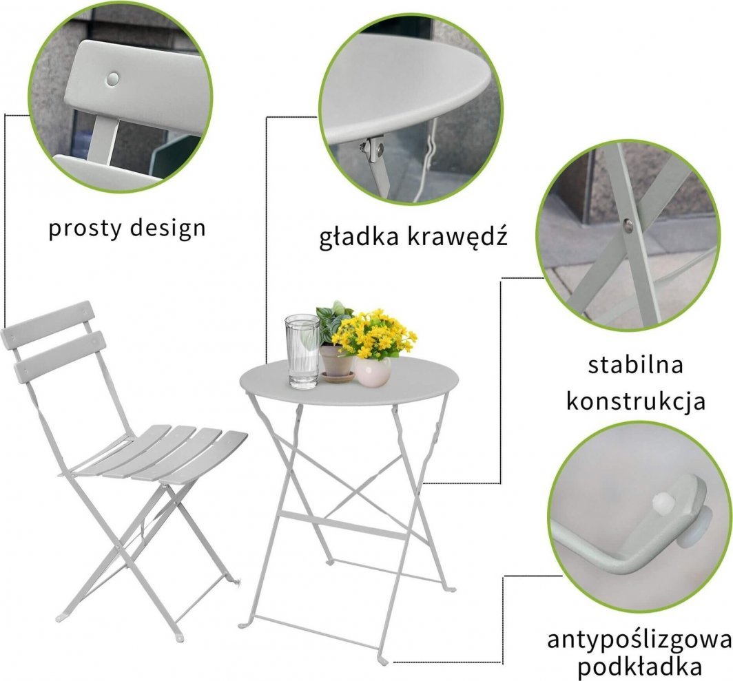 Балконний гарнітур ORION – ідеальне рішення для людей, які цінують відпочинок на природі.Набір, що складається з двох елегантних стільців і круглого столу, вражає не тільки своїм дизайном, але й ергономічним виконанням.Сіра металева конструкція гарантує довговічність і стійкість до погодних умов, забезпечуючи тривале задоволення від використання.Завдяки компактним розмірам в складеному вигляді набір легко поміститься в багажник автомобіля, що дозволить зручно транспортувати його на пікнік або в поїздку за місто.Додатковою перевагою меблів є спеціальні накладки на ніжки, які забезпечують безпеку поверхні та стійкість меблів.Сядьте на м’яку подушку на стільці та насолоджуйтесь моментом відпочинку на балконі, терасі чи в саду, насолоджуючись святковою атмосферою щодня.Колір: Сірий Матеріал: Метал Спинка: Метал Ширина сидіння: 42 см Глибина сидіння: 35 см Висота сидіння: 42 см Вага виробу: 13,7 кг Висота стільця: 81 см Загальна ширина стільця: 42 см Загальна глибина стільця: 48 см Кількість стільців у комплекті: 2 Збірка: меблі для самостійної збірки Максимальне навантаження на стілець: 120 кг Максимальне навантаження на стіл: 60 кг Висота столу: 71 см Ширина столу: 44 см Глибина столу: 53 см Діаметр стільниці: 60 см Тип стільниці: Кругла