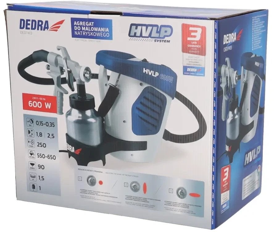 Фарбувальний агрегат HVLP для фарбування спреєм, DEDRA DED7413 600 Вт, бак 1 л, сопло 1,8 мм і 2,5 мм. Фарбувальний агрегат DEDRA DED7413 HVLP – надійний інструмент, який гарантує швидке і зручне фарбування на різних поверхнях, незалежно від їх розміру і типу.Відмінно підходить для стандартного фарбування стін і стелі, а також робіт, пов’язаних з грунтуванням або захистом деревини.Він також чудово розписує елементи незвичайної форми, як металеві, напр. ворота та огорожі, а також дерев’яні, напр. сараї або садові альтанки.Завдяки технології HVLP (High Volume Low Pressure) фарбування стає ефективнішим та економнішим.Сильний струмінь фарби при низькому тиску забезпечує рівномірне покриття поверхні, що означає економію матеріалів і часу.Точне регулювання розпилення гарантує ідеальний результат фарбування без смуг, що робить роботу ще більш ефективною.1-літровий резервуар для фарби позбавляє від необхідності часто припиняти роботу для заправки фарби, тож ви можете зосередитися на фарбуванні без непотрібних перерв.Крім того, міцна конструкція з алюмінію забезпечує довговічність і стійкість до пошкоджень, а значить, пристрій прослужить довго.Особливості фарбувальної установки DEDRA DED7413 HVLP: Фарбувальна установка HVLP (High Volume Low Pressure) Висока ефективність при низькому тиску Швидкий і комфортний спосіб фарбування різних поверхонь Точне вертикальне і горизонтальне фарбування без смуг Регулювання форми струменя розпилювача зміною положення кришки сопла в пістолеті для фарби Бак для фарби об’ємом 1 л запобігає частим перервам на заправку Пістолет і бак виготовлені з алюмінію гарантують високу стійкість до пошкоджень Всі необхідні для роботи елементи входять в комплект