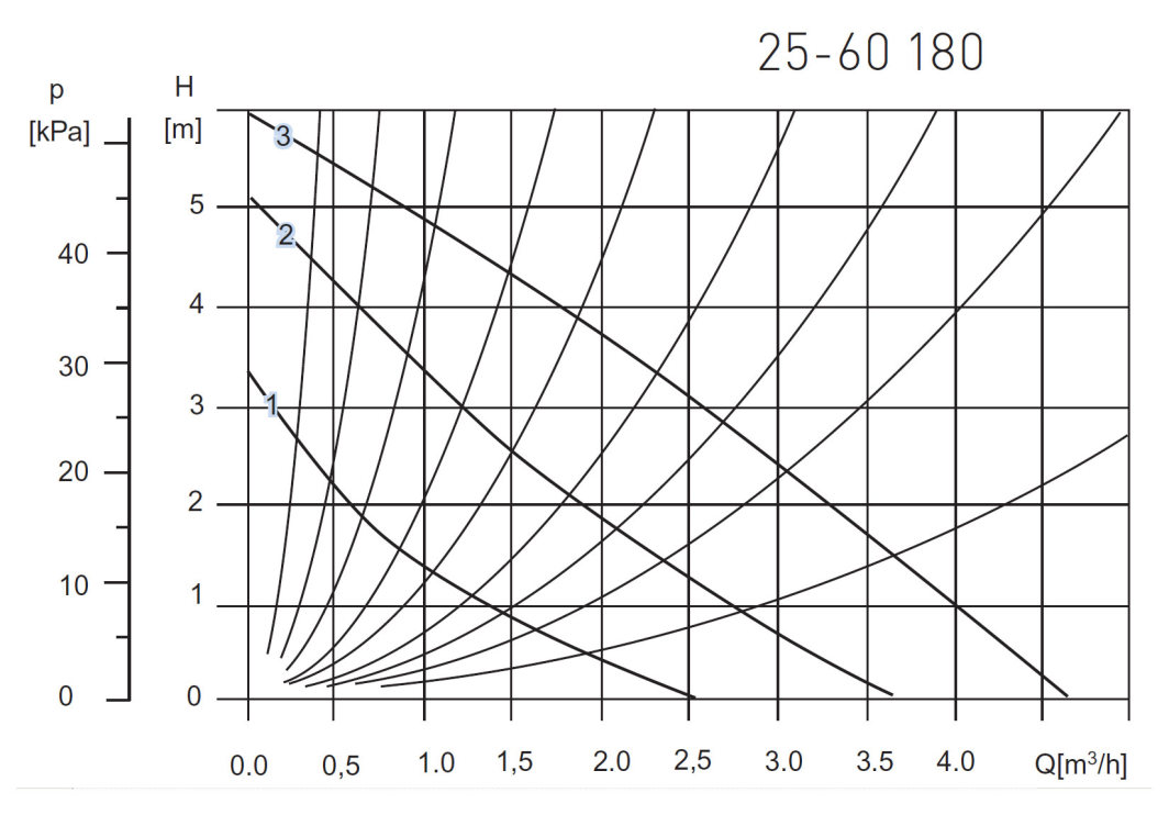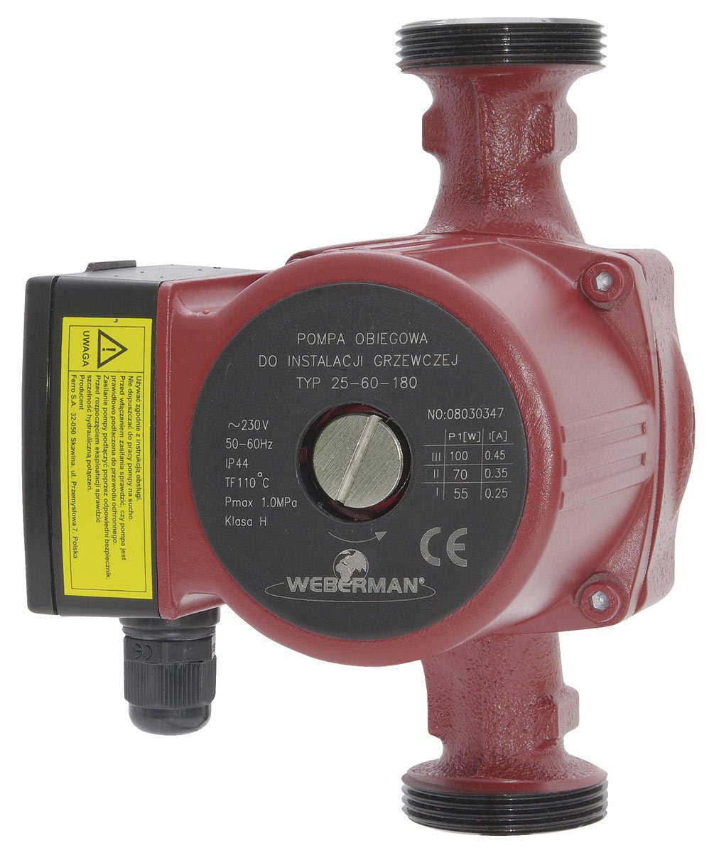 Насос циркуляційний 25-60 180 (0202W) Насос Weberman Призначений для систем центрального опалення.Корпус насоса виготовлений з чавуну, корпус – з литого алюмінію, робоче колесо – з пластику.Якісний двополюсний асинхронний двигун, не вимагає захисту від перевантажень, має три швидкості обертання, що регулюються за допомогою спеціального перемикача, встановленого на клемній коробці, що дозволяє адаптувати роботу насоса до особливостей установки.Пристрій відповідає європейським стандартам EN 60335-1 і EN 60335-2-51.Він має сертифікат відповідності CE, виданий Польським центром випробувань і сертифікації на основі проведених там випробувань продукції.Технічні дані: Модель: 25-60 180 Робочий діапазон: 0,2 – 4,5 м³/год Висота підйому: макс.5,5 м Температура рідини: мін.+2°C, макс.+110°C Тип перекачуваної рідини: чиста, без вмісту твердих часток або мінеральних нафтових речовин, не в’язка, хімічно нейтральна, з параметрами, подібними до води Максимальний тиск: 10 бар Клас захисту: IP 44 Клас ізоляції: H Кабельний ввід: PG 11 Установка: з віссю вала в горизонтальному положенні та з вільно розміщеною клемною коробкою, але не під насосом Напруга: 50-60 Гц, ~230 В Споживана потужність (I,II,III): 55/70/100 Вт Відстань підключення: 180 мм Підключення: 1 1/2″ Температура навколишнього середовища: мін. +2°C, макс. +40°C