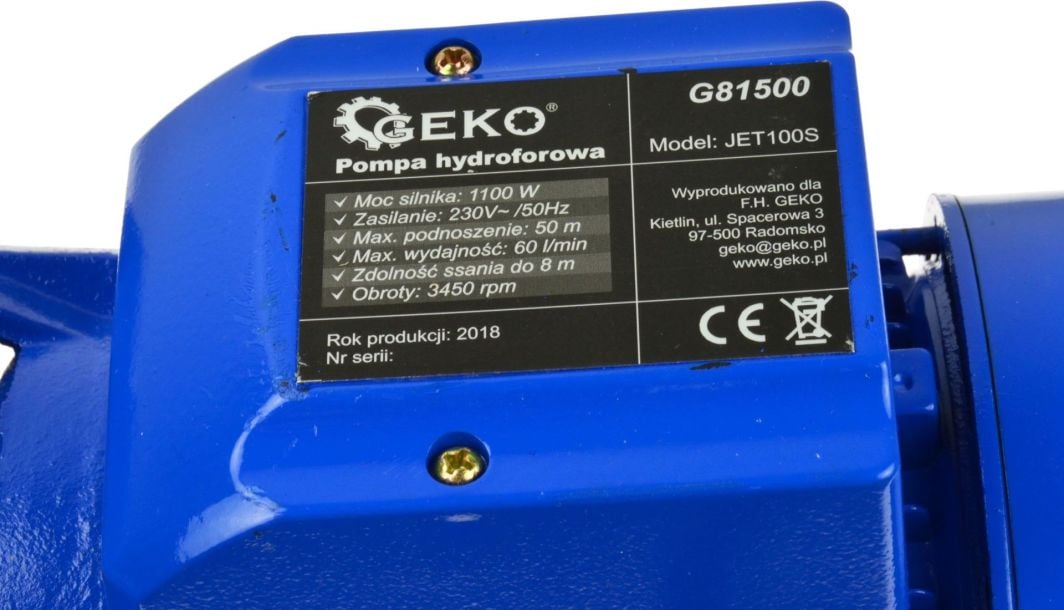 Самовсмоктуючий насос серії JET призначений для перекачування чистої води, може використовуватися для підйому води з колодязів, ставків і т.д., також може використовуватися для поливу садів, городів, для подачі води в будинок.Характеристики продукту: Потужний двигун 1100 Вт з мідною обмоткою, призначений для чистої холодної води продуктивністю до 60 л / хв Температура рідини до + 40 ° C Технічні дані: Потужність двигуна: 1100 Вт Макс.висота підйому: 8 м Макс.відстань випуску: 50 м. Потік: до 60 л/хв. Швидкість холостого ходу: 3450 об./хв. Тип підключення шланга: Тонкий 30 Макс.Температура навколишнього середовища: + 40 ° C Охолодження: зовнішня вентиляція Корпус насоса: чавун Обмотка двигуна: мідний дріт Корпус двигуна: алюміній Клас захисту: IP44 Клас ізоляції: B