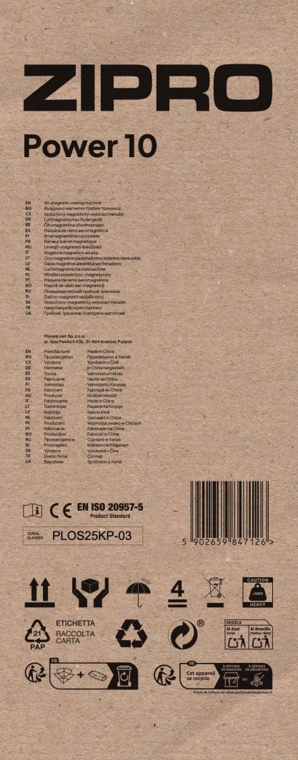 ZIPRO Power 10 – ergonomiczny wioślarz o nowoczesnym designie Wybierając wioślarza, warto zwrócić uwagę na kilka kluczowych cech produktu. ZIPRO Power 10 zapewni Ci: stabilną, solidną konstrukcję – zapewnia to całkowite bezpieczeństwo i komfort użytkownika. Maksymalny udźwig maszyny to aż 180 kilogramów; połączenie oporu powietrznego z magnetycznym – umożliwia szerszą skalę regulacji, a także dostosowanie wioślarza, by ruch był wykonywany jak najnaturalniej; znakomitą ergonomię – sprzęt jest lepiej dostosowany do anatomii użytkownika, dzięki czemu trening jest jeszcze bardziej efektywny; komputer z programami i funkcjami treningowymi; integrację z aplikacjami treningowymi. Powietrzno-magnetyczny układ oporowy Powietrzno-magnetyczny opór w urządzeniu pozwala na trening na najwyższym poziomie. Oporem magnetycznym sterujesz z poziomu komputera, a powietrzny regulowany jest przy pomocy dźwigni. Opór magnetyczny ma aż 32 poziomy ustawień, a powietrzny 10. Umożliwia to dokładne dostosowanie wioślarza do siły i możliwości osoby ćwiczącej. Dzięki temu intensywność treningu może być odpowiednia dla osób, które dopiero rozpoczynają przygodę z tego typu ćwiczeniami, jak i profesjonalistów. Komputer we wioślarzu ZIPRO Power 10 Chcesz zadbać o to, by Twój trening przynosił najlepsze efekty? Zapewnią Ci je opcje, które odnajdziesz w komputerze ZIPRO Power 10. Ten element zadziała niemal jak trener personalny, dbając o najlepszą jakość ćwiczeń. Do wyboru masz kilka programów treningowych, które są łatwe do ustawienia. Zróżnicowane opcje zapewniają efektywny i motywujący trening. Możliwość wyboru odpowiedniej rutyny pozwala na dopasowanie do każdego użytkownika. Na komputerze ZIPRO Power 10 możesz również na bieżąco śledzić swoje postępy. Monitorowanie ich zapewni Ci ciągłą motywację, aby osiągać coraz lepsze rezultaty. Chcąc dążyć do długoterminowego rozwoju fizycznego – to znaczne ułatwienie, gdy możesz podglądać, jak Ci idzie, widzieć progres, a także korzystać z różnorodnych treningów. Programy treningowe w ZIPRO Power 10 We wioślarzu ZIPRO Power 10 odnajdziesz aż 12 programów treningowych. To optymalna ilość, która zadowoli każdego. Niezależnie czy to jeden z Twoich pierwszych treningów, czy jesteś profesjonalistą – bez kłopotu znajdziesz odpowiednią opcję. Ze sprzętem od ZIPRO nie musisz samodzielnie planować sesji. Urządzenie robi to za Ciebie! Dostosowane programy treningowe to strzał w dziesiątkę dla początkujących. Zaplanuj i zapisz swój program Jeśli chcesz więcej – stwórz własny program użytkownika. Zostanie on zapisany w pamięci komputera, byś mógł zawsze do niego wrócić. Ćwiczenia dostosowane do Twoich możliwości przyniosą najlepsze rezultaty. Programy HRC dla indywidualnych potrzeb użytkownika Dzięki programom HRC w ZIPRO Power 10 opór jest dostosowywany automatycznie. Ma to na celu utrzymywanie odpowiedniego tętna, dzięki czemu osiąganie wyznaczonych celów treningowych jest znacznie łatwiejsze. Trening w odpowiednich strefach pulsu przynosi różne efekty. Mogą one aktywnie wspierać spalanie tkanki tłuszczowej, wzmacniać kondycję czy też poprawiać wydolność osoby ćwiczącej. Weź udział w wyścigu wioślarskim! Lubisz rywalizację? Motywuje Cię możliwość wygranej? Wprowadź to do swojej rutyny treningowej! W ZIPRO Power 10 możesz włączyć funkcję „RACE” i połączyć przyjemne z pożytecznym. Program „RACE” dostarcza elementu rywalizacji, dzięki czemu zwiększa zaangażowanie w regularne treningi. Jest to miła odmiana od programów treningowych. Wyścig wioślarski z pewnością zachęci Cię do osiągania nowych rekordów. Trening z aplikacją kompatybilną z ZIPRO Power 10 Oprócz intuicyjnego i przyjemnego w obsłudze komputera w ZIPRO Power 10, swoje treningi możesz urozmaicać z pomocą aplikacji. Kinomap zapewni Ci znakomite ćwiczenia, podczas których skorzystasz z gotowych tras, przenosząc się w różne miejsca przy pomocy smartfona. Dzięki aplikacji Kinomap możesz także rywalizować z innymi „wioślarzami”, udostępniać swoje osiągnięcia w social mediach czy też zwyczajnie uatrakcyjnić swój trening. Inną kompatybilną aplikacją jest iConsole+ Training. Przyda Ci się ona do wygodnego sterowania urządzeniem. Ustalisz tam długoterminowe treningi, przeanalizujesz statystyki i zobaczysz na bieżąco, jak zachowuje się Twoje ciało podczas ćwiczeń. Korzystanie z obu aplikacji podczas ćwiczeń jest bardzo wygodne, ponieważ wioślarz wyposażony jest w półkę na urządzenie mobilne. Znajdziesz ją tuż nad wyświetlaczem. Dzięki niej możliwe jest stabilne zamontowanie smartfona, na którym wyświetlają się pożądane dane. Wioślarz ZIPRO Power 10 – zyskaj to, co najlepsze! Wybierając wioślarza ZIPRO Power 10, stawiasz na najwyższą jakość. Ergometr wioślarski ma wytrzymałą, stalową konstrukcję wspartą na szerokich stabilizatorach, dzięki czemu jest stabilny i posłuży Ci przez długie lata. Funkcje, które oferuje wioślarz ZIPRO gwarantują najwyższą jakość wykonywanych ćwiczeń. Zapewniają one przyjemny, zróżnicowany trening, który nieustannie motywuje do osiągania lepszych efektów. Wspiera je możliwość podglądania i zapisywania pomiarów, co jest niezbędne do tego, by osiągać swoje cele treningowe. Imponujący przesuw W tym wioślarzu zastosowano przesuw, który jest bardzo długi. Wynosi on aż 145 centymetrów! Zapewnia to dopasowanie do praktycznie każdego użytkownika, zapewniając wygodne, a przede wszystkim poprawne technicznie ćwiczenia. Nośność tej maszyny wynosi 180 kg. Stalowy łańcuch We wioślarzu ZIPRO Power 10 zastosowano stalowy łańcuch. Zapewnia on efektywne przenoszenie siły. Materiał jest wytrzymały, co gwarantuje, że opór i ruch są równomiernie rozłożone. Nie ulega elastycznym odkształ