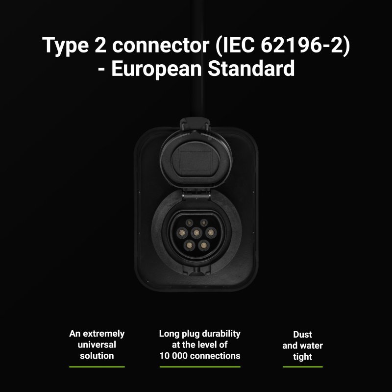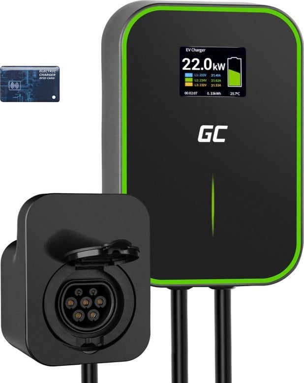 Найважливішими функціями GC EV PowerBox є зарядний пристрій, який підходить для всіх електромобілів EV і гібридів PHEV – зчитувач RFID-карт і роз’єм типу 2 – РК-екран із доступом до найважливіших параметрів, мінімалістичний дизайн і надзвичайна довговічність Комфортне заряджання та безпека – навіть за 3-4 години для автомобілів, які можуть заряджатися з потужністю 22 кВт, і близько 5-7 годин для автомобілів з потужністю 11 кВт (від 5-10% до 90%).Основа безпеки – вбудоване УЗО типу A + 6mA DC Простота установки – в комплекті з зарядним пристроєм є все необхідне для швидкої установки зарядного пристрою на стіну або стовп, включаючи: шаблон для свердління, набір шурупів і дюбелів і тримач для зручного зберігання кабелю на стіні.Заряджає всі електромобілі, у тому числі: Tesla Model 3 S. Оснастіть себе зарядним пристроєм GC EV PowerBox сьогодні та перетворіть свій гараж, домашнє приміщення чи офісну автостоянку на місце, зручне для користувачів EV / PHEV.Сучасна система швидкої зарядки та мінімалістичний дизайн – це те, що ви отримуєте із зарядним пристроєм Green Cell.РК-дисплей – усе під контролем Усі важливі дані про зарядку тепер у вас під рукою – поточна потужність, тривалість сеансу, робоча температура та навіть поповнена ємність.RFID У Wallbox вбудований зчитувач RFID-карт, завдяки якому ми можемо легко та швидко активувати та завершити зарядку електромобіля.Простота встановлення 3-фазне підключення Просто підключіть 5 кабелів і зарядний пристрій готовий до роботи. Краще мати вибір.Гніздо типу 2 дозволяє підключити будь-який кабель, в залежності від того, який термінал вам зараз потрібен. Ну, кабель типу 2, а може, типу 1?Роз’єм типу 2 – європейський стандарт Гніздо для зарядного пристрою GC EV PowerBox є найпопулярнішим роз’ємом типу 2 у Європі (IEC 62196-2).Будучи стандартизованим роз’ємом, він забезпечить широку сумісність із кабелями, які можна придбати в ЄС, напр.Type 2 – Type 2 і Type 2 – Type 1. Не гайте часу і заряджайте свій автомобіль потужністю до 22кВт. Зарядний пристрій Green Cell забезпечує найшвидшу зарядку за допомогою змінного струму потужністю 22 кВт – більш ніж у 10 разів швидше, ніж від електричної розетки.На практиці це означає, що коли ви прокидаєтеся вранці, автомобіль заряджений на 100% і повністю готовий до будь-якого маршруту.Захисне УЗО типу A + 6 мА постійного струму Зарядний пристрій GC EV PowerBox оснащено всіма необхідними запобіжними засобами для захисту вашого автомобіля та зарядного пристрою від пошкодження.Сучасна електроніка, міцна і щільна конструкція гарантують надійність на довгі роки.Простий монтаж У комплекті з зарядним пристроєм є все необхідне для швидкого і повного монтажу зарядного пристрою на стіні, включаючи: шаблон для свердління, набір шурупів і дюбелів, а також тримач для зручного зберігання кабелю на стіні.ВАЖЛИВО: пристрій має встановлювати особа з відповідною кваліфікацією та повноваженнями.