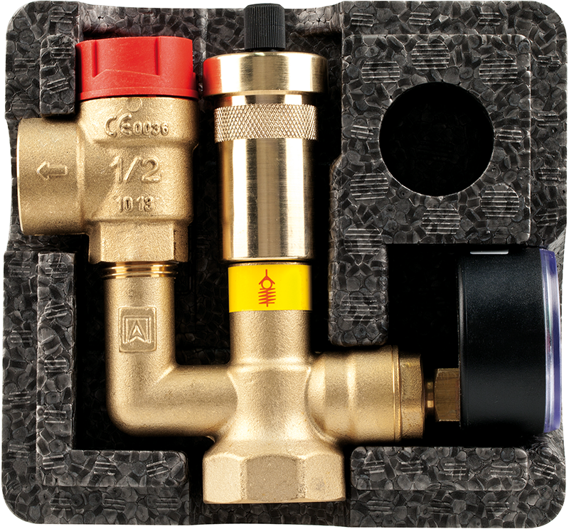 Група безпеки котла KSG mini з ізоляцією GW G1″ 77 623 Опис: Група безпеки KSG mini з ізоляцією – група безпеки котла, призначена для закритих систем опалення. Легкий монтаж за допомогою готового вузла з перевіреною на заводі герметичністю. Корпус групи безпеки виготовлено з латунного лиття без з’єднань. Манометр і повітровідвідник оснащені монтажними клапанами, що полегшує заміну без необхідності спорожнення установки. Ефективна вентиляція завдяки піднятому вентиляційному отвору. Технічні характеристики: 1” GW. Манометр: 0÷4. 120°C Максимальна потужність установки згідно з Управлінням технічної інспекції: 73,6 кВт Максимальна потужність установки згідно з TUV: 50 кВт