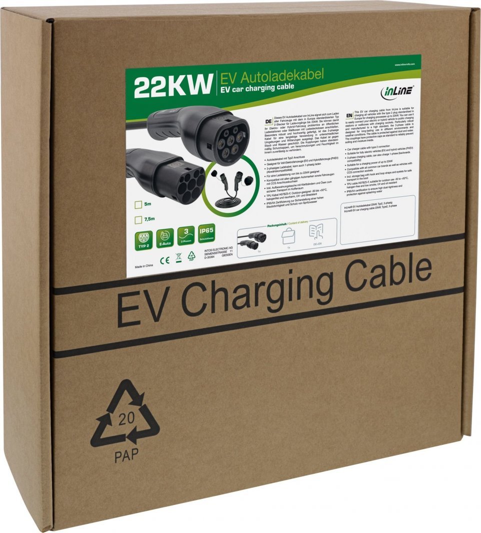 Цей зарядний кабель для електромобіля від InLine підходить для заряджання всіх транспортних засобів зі стандартизованою європейською розеткою типу 2 у процесах зарядки до 22 кВт.Ви можете легко підключити свій електричний або гібридний автомобіль до громадських зарядних станцій або настінних розеток за допомогою зарядних розеток.Особливо міцний і високоякісний 3-фазний кабель призначений для тривалого використання в різних середовищах і погодних умовах.Кабель захищений від пилу та води.Роз’єми стандартно оснащені захисними ковпачками, які ефективно запобігають забрудненню та волозі всередині.Основні характеристики: Кабель для зарядки автомобіля з роз’ємом Type2. Підходить для повністю електричних транспортних засобів (EV) і гібридних транспортних засобів (PHEV). магістральний кабель H07BZ5-F TPU, придатний для зовнішнього використання від -30 до +50°C, без галогенів і з низьким рівнем диму, стійкий до УФ-променів і масла, сертифікат IP65/54, що забезпечує високу пилонепроникність і захист від бризок води Технічні дані: Зовнішній діаметр: 16,8 мм Конструкція: 3-фазний 22 кВт Робоча температура: від -30 до +50°C Довжина: 5 м Сторона A: штекер CCS типу 2 (автомобільний кабель для заряджання) Сторона B: роз’єм CCS типу 2 (кабель для заряджання автомобіля) Особливість: IP65