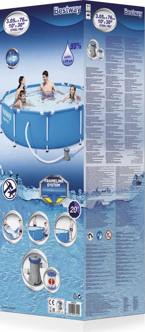 Каркасний басейн Steel Pro 305 см. Немає нічого кращого, ніж мати власний басейн у саду!Надземний плавальний басейн Bestway® Steel Pro пропонує надміцну споруду за привабливою ціною.Міцна конструкція Сталева рама, стійка до корозії, оснащена нашою системою FrameLink™, яка забезпечує надійне та надійне з’єднання рами, а також сумісність із кріпленнями, наприклад підстаканниками.Підкладка Tritech™ виготовлена ​​з міцного матеріалу, який посилений для довговічності та стійкості. Додаткові функції Цей набір для надземного басейну також постачається з фільтруючим насосом, щоб вода у вашому басейні була кристально чистою.Крім того, цей басейн дуже легко збирається і розбирається для зберігання в міжсезоння.Вам не потрібні жодні інструменти, а шланг підключається до вбудованого клапана регулювання потоку, що дозволяє швидко та легко злити воду з басейну.Проведіть літо на воді в басейні Bestway Steel Pro!Розмір: 3,05 м x 76 см Ємність для води (90%): 4678 л Посилена 3-шарова підкладка Tritech™ є міцною та стійкою до проколів. Корозійно-стійка сталева рама оснащена нашою системою FrameLink System™ для забезпечення надзвичайної міцності та стабільного з’єднання 1249-літровий фільтрувальний насос у комплекті. Легке збирання та розбирання без інструментів Вміст: 1 басейн, 1 фільтрувальний насос (сумісний з картриджем типу I)