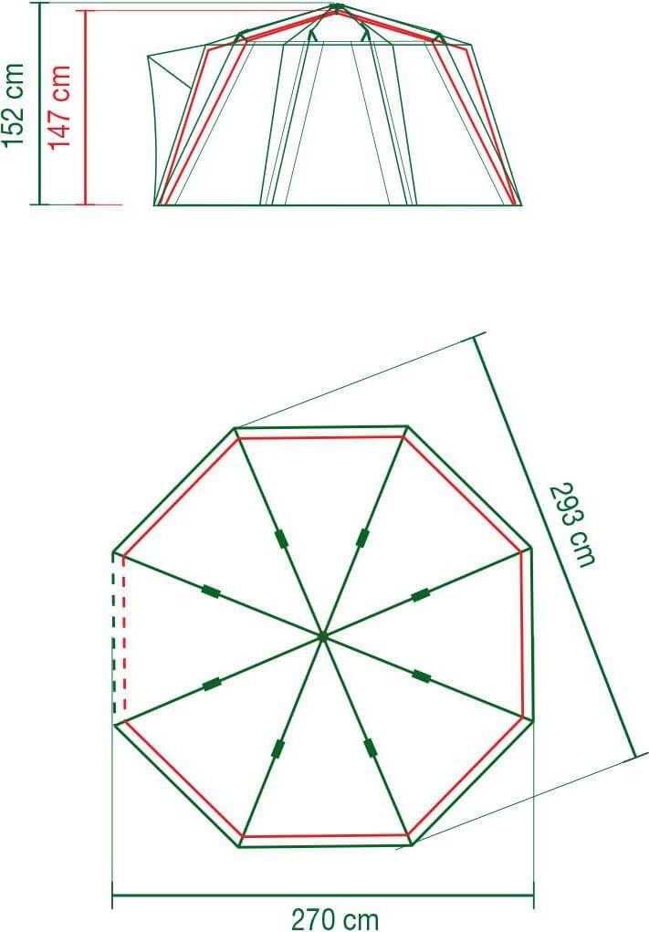 Туристичний намет Coleman Octagon Small 2 Вага (кг): 10,9 Водонепроникність (мм): 2000 Загальна площа (м2): 7,5 Розміри в упаковці (см): 69 x 25 x 25 Матеріали: спальня: поліестер, сітка тропіки: поліестер, поліуретанове покриття Підлога: поліетилен Каркас: сталь