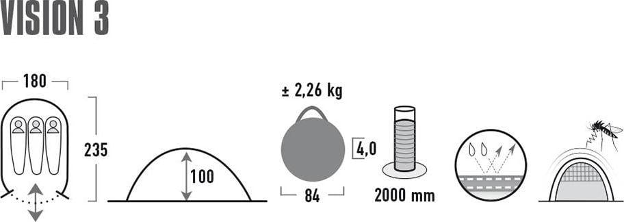 Туристичний намет High Peak Vision 3. Самоскладний намет High Peak Vision 3 економить багато часу, тому ви зможете довше насолоджуватися блаженним спокоєм природи та компанією друзів.Простий у використанні тримісний намет – чудове рішення для спонтанної поїздки за місто або літнього фестивалю на природі.Овальна форма підлоги.Вихід оснащений москітною сіткою.Водонепроникний, одношаровий лист.Справа.Технічні дані: · кількість осіб: 3 · водонепроникність: 2000 мм водяного стовпа · захисний лист: вогнестійкий 100% поліестер, покритий ПУ · спальня: 100% дихаючий поліестер, сітчастий вхід · підлога: 100% поліестер, покритий ПУ, герметичний · каркас: скловолокно 6 мм · розміри: 235 x 180 x 100 см · розміри в складеному вигляді: діаметр 82 см, товщина 4 см · вага: 2,26 кг · спосіб упаковки – все відразу