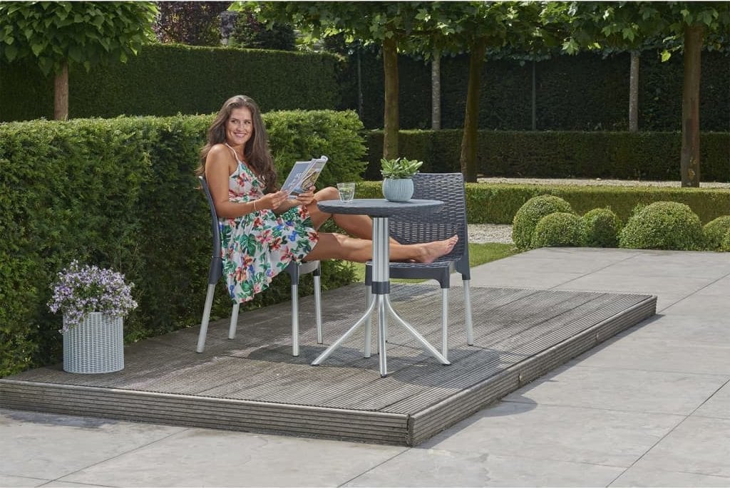 Додайте нотку британського стилю у свій басейн або патіо з набором для бістро Chelsea від Keter.Цей набір включає два елегантних садових стільця округлої форми та відповідний круглий стіл, виготовлений із ефектної суміші пластику з плетеною структурою та металевими ніжками.Стільниця виготовлена з міцного, міцного матеріалу, який захищений від ультрафіолету, тому не вицвітає на яскравому сонці.Вдома ви можете швидко зібрати свій новий комплект Keter за допомогою інструментів та інструкцій зі складання, що входять у комплект.Колір: антрацит і метал Матеріал: PP пластик і метал Розміри столу: 60 x 60 x 75 см (Д x Ш x В) Розміри: 46 x 56 x 86 см (Ш x Г x В) Продукт стійкий до УФ-променів Легкий продукт Продукт стійкий до погодних умов Не потребує обслуговування Довговічний продукт Легко збирається Продукт підлягає переробці Складається з одного столу та двох стільців