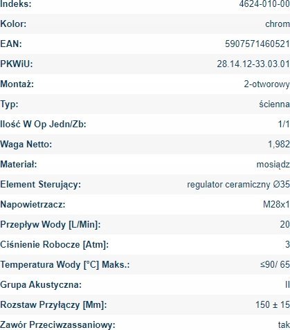 KFA 4624-010-00 Змішувач для ванни AMAZONIT – Елегантність і функціональність у вашій ванній кімнаті. Змішувач для ванни KFA 4624-010-00 Amazonit – це ідеальне поєднання сучасного стилю та практичності, яке чудово впишеться в будь-яку ванну кімнату.Його елегантний дизайн і функціональність роблять його продуктом, який точно задовольнить потреби навіть найвибагливіших користувачів.Унікальний дизайн колекції Amazonit. Характерні прямокутні вирізи в ручках змішувачів не тільки привертають увагу, але й надають сучасного характеру.Колекція Amazonit відрізняється своєю естетичністю, яка ідеально поєднується з різними стилями інтер’єру.Ергономічні ручки для зручності використання. Ручки змішувачів були розроблені з урахуванням зручності користувача.Їх ергономічна форма запобігає ковзанню у мокрих руках, що значно підвищує комфорт щоденного використання ванни.Зручний аератор «монетник» Аератор «монетник» – це інноваційне рішення, яке дозволяє легко чистити, що має вирішальне значення для підтримки змішувача у відмінному стані.Завдяки цьому користувачі можуть насолоджуватися безперебійною функціональністю протягом тривалого часу.Матеріал латунь – довговічність і якість Змішувач виготовлений з високоякісної латуні, що забезпечує його довговічність і стійкість до корозії.Завдяки цьому виріб не тільки естетичний, але й надзвичайно міцний, що робить його ідеальним вибором на роки.Пропускна здатність – 20 л/хв. Змішувач KFA 4624-010-00 забезпечує максимальний потік води 20 л/хв, що забезпечує ефективне та комфортне використання ванни.Працює при робочому тиску до 3 атмосфер, що гарантує стабільну та ефективну роботу.Технічні характеристики змішувача для ванни KFA 4624-010-00 Індекс: 4624-010-00 Колір: хром Монтаж: 2 отвори Тип: настінний Кількість в упаковці: 1 Вага нетто: 1.982 кг Матеріал: латунь Елемент управління: керамічний Регулятор Ø35 Аератор: M28x1 Потік води: 20 л/хв. Робочий тиск: 3 Atm Максимальна температура води: ≤90/65 °C Акустична група: II Відстань підключення: 150 ± 15 мм Противсмоктувальний клапан: так Вага продукту з упаковкою: 3,156 кг Сертифікати: відповідність стандарту PN-EN 817:2008, гігієнічний сертифікат, декларація відповідності Замовляйте зараз, щоб насолоджуватися найкращою якістю та ефективністю у своїй ванній кімнаті!Ідеально підходить для ваших потреб – доступний у Morele вже сьогодні!