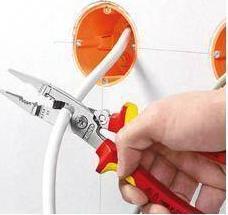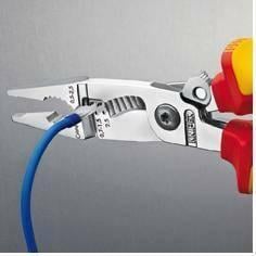 Електромонтажні кліщі VDE. Виготовлені з високоякісної спеціальної інструментальної сталі, ковані, загартовані в маслі та загартовані.Хромована головка, зубчасті поверхні захоплення, гладкі на кінчиках, для неруйнівного захоплення окремих пасом.Індукційно загартовані прецизійні леза.Гвинтове з’єднання для максимальної точності руху без люфту.Характерна зовнішня кромка губки для обробки коробок, що монтуються врівень, і видалення задирок через отвори.З вбудованою відкриваючою пружиною.Інтелектуальний механізм утримування дозволяє хапати, не відкриваючи чохли.Ручки з багатокомпонентними пластиковими кришками, виїмками для пальців і позначками, нанесеними фарбою.Ізольований до 1000 В, відповідно до IEC 60900, DIN EN 60900, VDE 0682/частина 201. Застосування: для універсальних робіт на електроустановках з 6 функціями: згинання, видалення задирок, різання кабелів, зняття ізоляції, обтиск кабельних гільз (трапецієподібний затискач) і захоплення предметів з плоским і круглим профілем.
