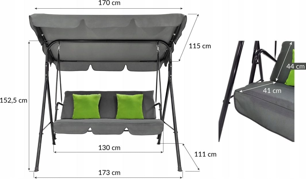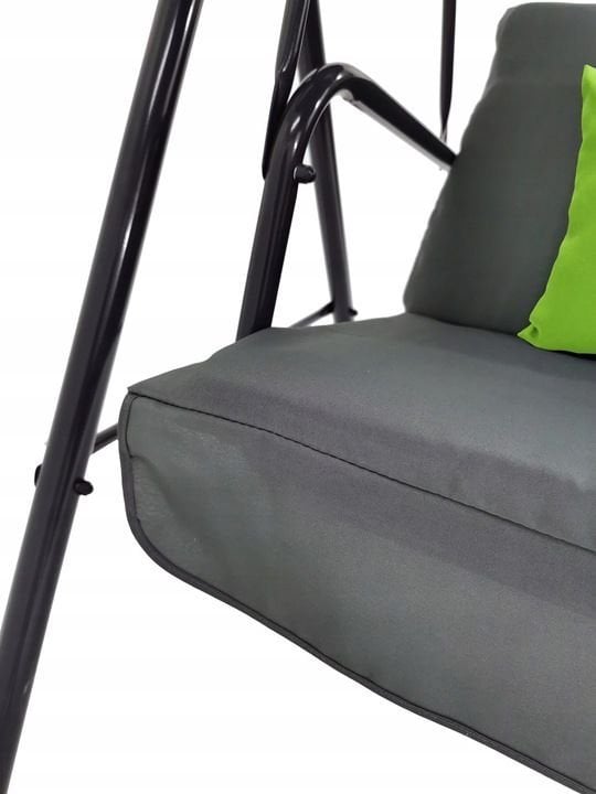 Садові гойдалки Caspi – сидіння для 3 осіб Характеристики виробу: Широке сидіння для 3 осіб Міцний сталевий каркас з порошковим покриттям Регульований навіс з підзором Чохол для сидіння з щільної брезентової тканини Сидіння з пінопласту, покрите тканиною У комплект входять 2 чорні подушки 40×40 Характеристики продукту: Максимальне навантаження: 200 кг Розмір коробки: 135 x 54 x 14 см Вага брутто: 17,8 кг