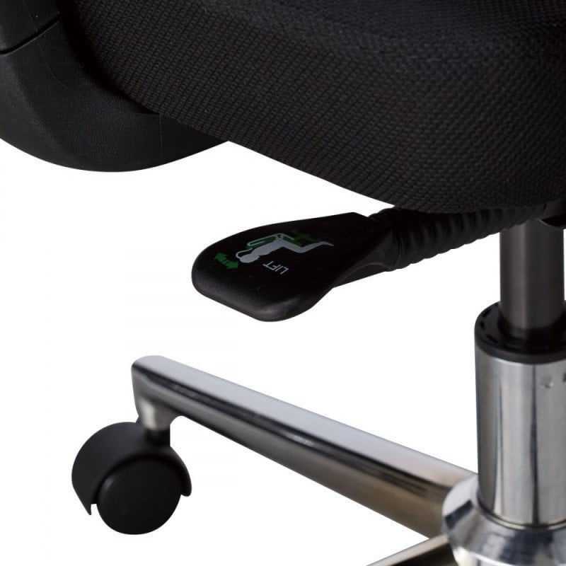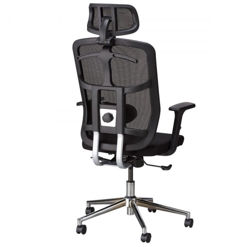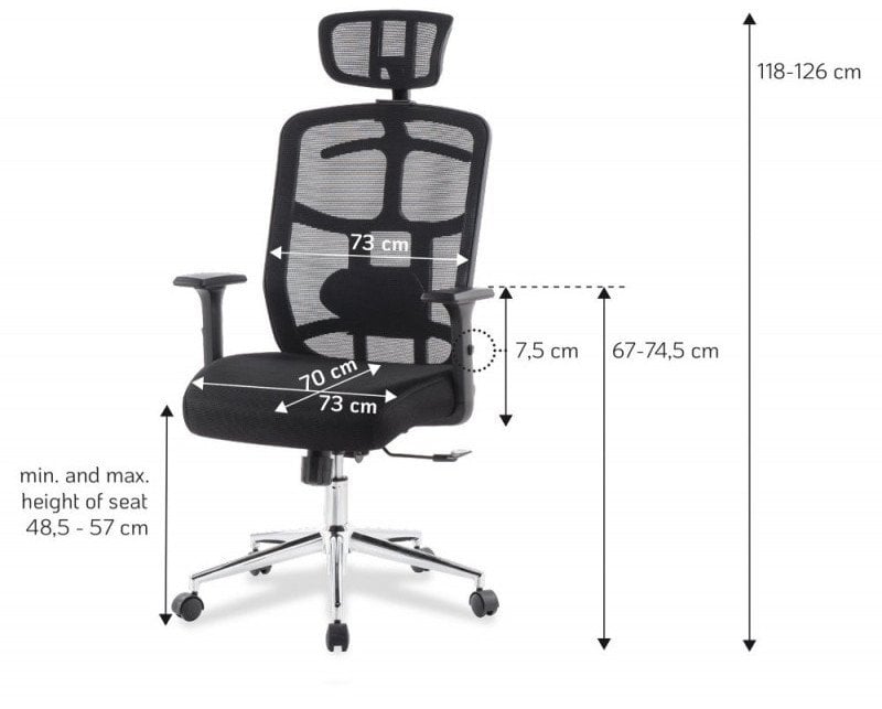 Обертове офісне крісло, крісло з регульованою вентильованою спинкою, поперековою підтримкою та підголівником Опис продукту: Велике м’яке м’яке сидіння забезпечує комфорт протягом довгих годин роботи Регульована сітчаста спинка гарантує комфорт і належну вентиляцію Сітчаста спинка значно зменшує відчуття тепла та потовиділення спини Спинка з регулюванням нахилу Зручний підголівник з регульованим положенням Поперекова опора хребта з регулюванням положення Пневматична Регулювання висоти сидіння Зручні профільовані підлокітники з 3D-регулюванням Хромована основа з п’ятьма спицями для стабільності та безпеки Колеса з ПУ забезпечують плавне пересування на будь-якій поверхні та захищають землю від подряпин Надзвичайно проста збірка всього за кілька хвилин Гарантія 3 роки Технічні параметри: Ширина: 70 см Глибина: 69,5 см Регулювання висоти: 120,5 – 128 см Колір: чорний Вага: 18,576 кг Комплектація: Крісло офісне поворотне з вентильованою спинкою Елементи монтажу Інструкція по монтажу
