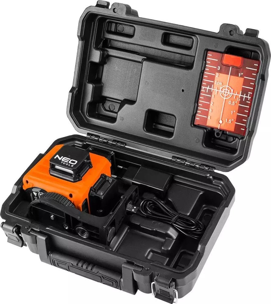 Neo Plane laser 75-104 червоний 15 м 3D лазер, червоний, валіза, мішень, магнітний тримач, зарядний пристрій NEO (арт. № 75-104) використовується в будівельних та оздоблювальних роботах.Червоний лазерний промінь може проектуватися в трьох площинах на відстань до 15 метрів.Лазер оснащений механізмом самовирівнювання в діапазоні +/- 4°, що дозволяє виконувати точну роботу без необхідності ручного введення налаштувань.Магнітний тримач дозволяє кріпити виріб на металеві поверхні.У набір входить: лазер, цільовий диск, магнітний тримач, зарядний пристрій і пластиковий транспортний кейс.Якість гарантується європейським сертифікатом CE.