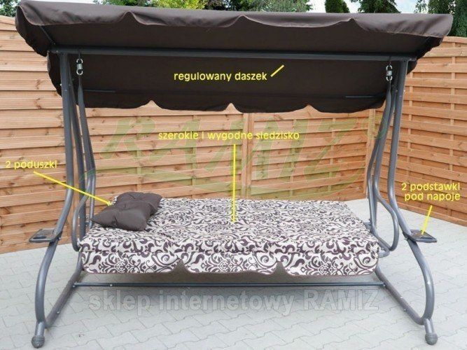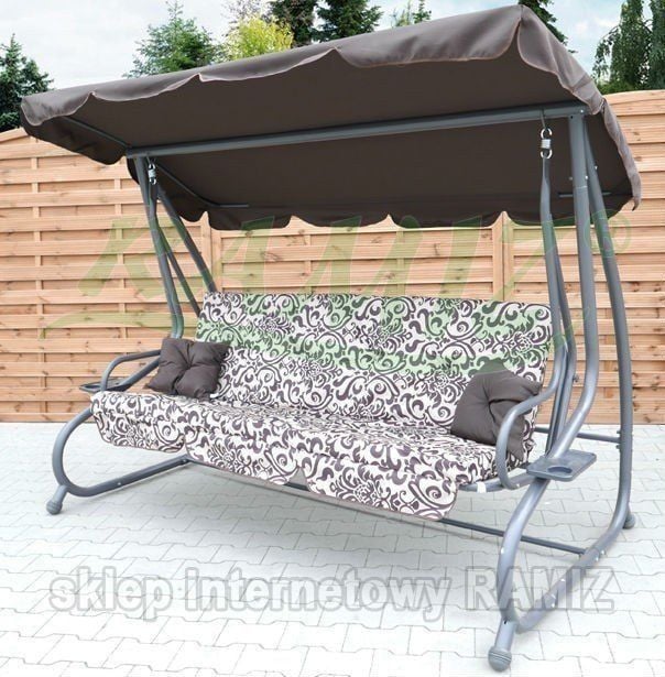 Опис Садові гойдалки зі складаним сидінням і регульованим навісом, темно-коричневого кольору з малюнком [8011 PATTERN CB] Сидіння виконано з матеріалу Textiline з переплетенням 2х1. Матеріал, з якого виготовлена ​​сітка, – поліефірна пряжа, покрита вінілом.Textiline призначений для зовнішнього використання завдяки високій стійкості до суворих погодних умов.Сітка надзвичайно гнучка і стійка до розтягування, що додатково впливає на комфорт використання, а сам матеріал не деформується.2 стьобані подушки та матрац для сидіння (губка для оббивки 10 см), багатоступінчасте, плавне регулювання купалу, чохол на балдахін з поліестеру щільністю 180 г, зручне розкладне сидіння, яке можна використовувати як для сидіння, так і для лежання, 2 підставки для напоїв, кріплення гойдалок на пружинах, конструкція зі сталі з порошковим покриттям, якісні зварні шви, висока стійкість до погодних умов, масивна нековзна гума на кінцях ніжок, дуже легко підтримувати в чистоті, чохол на сидіння з поліестеру вагою 160 г, максимальне навантаження 300 кг., Розміри Зовнішні розміри ширина прибл. 214 см, глибина бл. 114 см, висота плафону в центральній частині бл. 168 см, вага прибл. 39 кг, висота спинки сидіння без матраца прибл. 50 см, глибина сидіння без матраца бл. 48 см, довжина сидіння без рами прибл. 185 см, ширина сидіння в розкладеному вигляді прибл. 100 см, довжина купола прибл. 220 см, ширина бл. 117 см, довжина матраца прибл. 180 см, сидіння бл. 48 см, спинка прибл. 51 см, ширина в розкладеному вигляді прибл. 101 см, розмір упаковки 207 х 57 х 30 см, вага 41 кг, товщина трубок для ніжок рами 48 х 1,1 мм, верхньої рами 48 х 1,1 мм, рами сидіння 32 х 1,2 мм, посилення гойдалок 25 х 0,8 мм, рами сидіння 28 х 1,5 мм, рами навісу 16 х 0,6 мм,