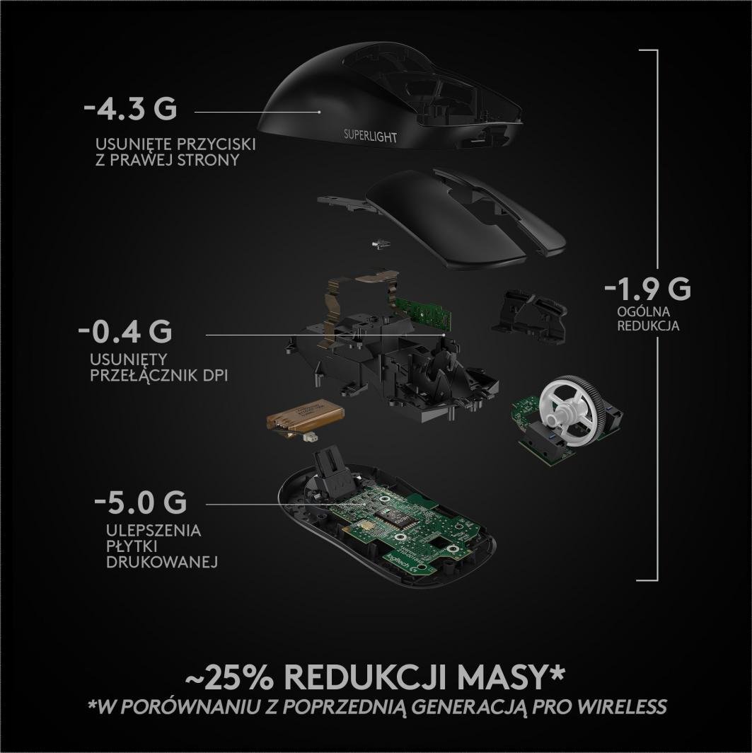 Легкість і динамічна швидкість – це Logitech G Pro Сенсор надзвичайно чутливий і точний. Чутливість до 25 600 DPI: миша адаптується до стилю гри, пропонуючи контроль над кожним рухом і завданням. Бездротове з’єднання LIGHTSPEED: швидке та стабільне з’єднання, що усуває затримки та перешкоди.5 програмованих кнопок: їх можна адаптувати до ваших потреб і улюблених функцій, що значно полегшує гру. Точність і швидкість, яку оцінять професіонали. Комп’ютерна миша G Pro X Superlight Black – точний інструмент. для гравців, яким потрібна оптимальна точність і швидкість. Завдяки своїй надлегкій конструкції, вагою менше 63 грамів, миша Logitech дозволяє довго грати без втоми рук.Ігрова миша Logitech G Pro — це цікавий вибір як для професійних геймерів, так і для любителів кіберспорту, яким потрібна максимальна продуктивність у будь-якій ситуації.Особливо варто відзначити передовий та інноваційний оптичний сенсор HERO 25K Pro X Superlight.Ця технологія забезпечує безпрецедентну точність і точність рухів.Датчик забезпечує чутливість до 25 600 DPI, що забезпечує надзвичайно точне відстеження рухів.Це важливо в динамічних іграх FPS і MOBA.Бездротова технологія LIGHTSPEED гарантує надійне з’єднання з низькою затримкою.Це виключає будь-які простої та забезпечує миттєве реагування на рухи гравців.Logitech G Pro X Superlight – гарантія безперебійного ігрового процесу Комп’ютерна миша G Pro X Superlight Black (910-005880) працює до 70 годин на одному заряді.Це особливо важливо для гравців, які беруть участь у турнірах або тривалих тренуваннях, де надійність обладнання має вирішальне значення.Надійна ігрова миша?Logitech G Pro може стати хітом!Поверхня з ПТФЕ з низьким коефіцієнтом тертя забезпечує плавні та точні рухи кожної накладки, що особливо важливо в напружених ігрових сценах.П’ять програмованих кнопок дозволяють налаштувати функції миші відповідно до ваших потреб, що може значно підвищити вашу ефективність в динамічних іграх.Це обладнання з сучасним мінімалістичним дизайном.Мишка може сподобатися гравцям, які шукають нестандартні рішення.Як бачите, модель Pro X Superlight — це надійна ігрова миша Logitech G Pro.Підходить для гравців, які шукають максимальну продуктивність, точність і комфорт.Завдяки надлегкій конструкції, передовому сенсору HERO 25K і технології LIGHTSPEED гризун відповідає світовим стандартам професійних ігор.Ігрова миша Logitech G Pro X – незамінний елемент обладнання для кожного геймера, який цінує якість і надійність.Технічні характеристики Вага: Датчик: HERO 25K Роздільна здатність: 100-25600 DPI З’єднання: Бездротовий LIGHTSPEED Акумулятор: До 70 годин безперервного використання Прискорення: > 40 G Швидкість: > 400 IPS Кнопки: 5 програмованих кнопок Поверхня: PTFE із низьким коефіцієнтом тертя Колір: Чорний Розміри: 125 × 63,5 × 40 мм Поширені запитання Які кольори доступні для Logitech G Pro X Superlight?Миша Logitech G Pro X Superlight доступна в чорному та білому кольорах.Чи можу я використовувати Logitech G Pro X Superlight із панеллю Powerplay?Так, Logitech G Pro X Superlight сумісний із планшетом Powerplay, що дозволяє заряджати його без проводів під час використання.