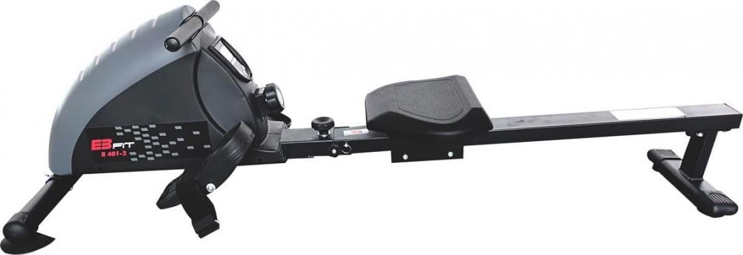 Магнітний гребний тренажер R401-2 Eb Fit висока якість виготовлення та довговічність дозволяють безперервно тренуватися вдома конструкція гребного тренажера дозволяє проводити комплексні кардіотренування без навантаження на суглоби зручні довгі ручки, вкриті м’якою губкою підвищують комфорт використання ергономічне сідло дозволить нам довго тренуватися в зручному положенні 8 рівнів опору, змінюваних за допомогою ручки на панелі керування дозволяє адаптувати його до наших можливостей рухливий РК-дисплей показує кількість спалених калорій, кількість повторень за хвилину та час виконання вправ, ніжки, на яких стоїть пристрій, закріплені якісними гумовими кріпленнями, які захищають підлогу від подряпин, область ніг закріплена міцною регульованою липучкою, швидке складання дозволяє легко скласти пристрій, заощаджуючи таким чином місце в кімнаті. Мрієте про спортивну фігуру?У вас немає часу на спортзал!Ваш вибір повинен припасти на магнітний гребний тренажер R401-2 Eb Fit. Шукаєте щось ефективне для вправ, що зміцнить верхню та нижню частину тіла?Регулярні заняття на гребному тренажері R401-2 Eb Fit допоможуть вам покращити свою фізичну форму та зовнішній вигляд, не навантажуючи суглоби.Пристрій стимулює справжнє веслування.Завдяки йому ви можете тренувати багато груп м’язів у власному будинку.Гребний тренажер – це тренажер для веслування, який призначений для зміцнення м’язів верхньої частини тіла, рук, спини та преса.Не чекайте до весни!Купити магнітний гребний тренажер R401-2 Eb Fit Параметри: канатний привід з магнітним колесом з гальмівною системою 8-ступінчастий дисплей регулювання опору: 5 функцій: час, кількість гребків / хв, пройдена відстань, сканування, витрачені калорії сталевий каркас з порошковим покриттям Клас пристрою: H – домашнє використання Вага нетто: 19 кг складний: Так Інтуїтивно зрозумілий у використанні, панель керування відображає наступні параметри: сканування – сканування всіх параметрів time – підрахунок часу (cnt) – підраховує кількість помахів веслами total count – підраховує загальну кількість помахів веслами calories – кількість спалених калорій count/min – підраховує загальну кількість помахів веслами за хвилину
