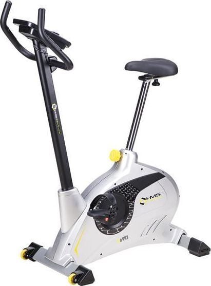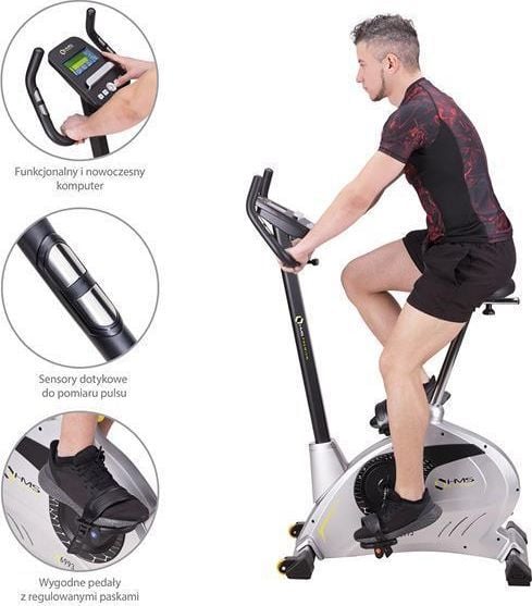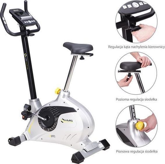 The M6993 HMS PREMIUM magnetic bike is fitness equipment that is perfect for training at home.Їзда на велотренажері – це не що інше, як кардіотренування, тобто тренування на витривалість, спрямоване на підвищення ефективності роботи серця.One might be tempted to say that this form of training is one of the simplest and safest cardio classes.Thanks to the magnetic resistance system, the exercises are quiet and therefore do not disturb other people around you.The bike has a 24-step resistance adjustment, so we can adapt the training to any level of advancement.Функціональний і сучасний комп’ютер враховує і відображає всі найважливіші параметри тренування.Він також має загалом 24 вбудовані програми.This gives you the opportunity to choose a program that will suit your individual training goals.M6993 – міцна, стійка конструкція.Вирівнювальні ніжки допоможуть вам рівномірно розташувати обладнання, а встановлені транспортувальні колеса полегшать переміщення.Регульоване сідло та зручні педалі з регульованими ремінцями є ще одними перевагами цього надзвичайно вдалого дизайну.Велосипед M6993 HMS PREMIUM – це універсальна техніка, яка завдяки своїм невеликим розмірам і вазі знайде своє місце в кожному домі, навіть у невеликому приміщенні.