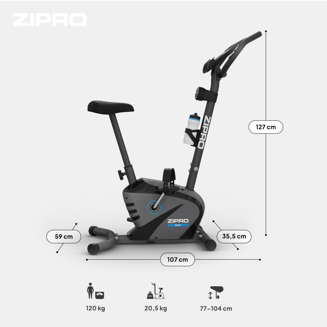 ZIPRO Beat Регулярна фізична активність – це перевірений шлях до здоров’я, форми та гарного настрою. Виконуйте свої плани щодо фітнесу, не виходячи з дому!Велотренажер Beat ZIPRO – це ключ до схуднення, покращення фізичної форми та ефективного спалювання калорій.З ним ваша квартира перетворюється на міні-спортзал, а ви можете піклуватися про свою фізичну форму, незважаючи на щоденний хаос.Почніть піклуватися про свою фізичну форму вже сьогодні та відкрийте в собі нову енергію!Велосипед ZIPRO Beat допоможе вам втілити ваші мрії про хорошу фізичну форму, струнку фігуру і сильні м’язи.Його конструкція з широкими та відповідним чином профільованими основами гарантує стійкість, а вирівнювальні накладки дозволяють розмістити велосипед на будь-якій поверхні, навіть нерівній.Тренуйтеся ефективніше, вимірювайте свій прогрес!Багатофункціональний комп’ютер – сильна сторона велосипеда Beat.Завдяки чіткому дисплею ви можете відстежувати найважливіші параметри тренування, а функція сканування автоматично перемикає інформацію, що відображається.Контролюйте свої тренування та досягайте своїх цілей. Завдяки комп’ютеру ви можете програмувати тренування, встановлюючи час їзди, відстань і кількість калорій.Комп’ютер підраховує ці значення в зворотному порядку, а коли відлік закінчується, лунає звуковий сигнал.Це значно спрощує планування та досягнення цілей навчання.Поєднуйте приємне з корисним: навчання та онлайн!Завжди залишайтеся на зв’язку, навіть під час навчання.Телефон на підставці, повідомлення під контролем.Beat – це велосипед, який забезпечить вам максимальний комфорт і задоволення від їзди. Для ефективного тренування на велотренажері необхідна правильна постава.Щоб забезпечити комфорт під час тривалих вправ, важливо, щоб обладнання оптимально підходило до фігури тренуючого.Вибираючи тренажер, зверніть увагу на його вантажопідйомність, яка залежить від вашої ваги та зросту.Відповідна вантажопідйомність має вирішальне значення для комфорту та безпеки під час тренувань.ZIPRO Beat – велосипед зі стабільною структурою, що дозволяє персоналізувати налаштування.Завдяки цьому ви можете легко налаштувати його відповідно до своїх потреб, щоб займатися безпечно та ефективно.Ви можете легко і зручно встановити: висоту сідла (діапазон 77-104 см від землі), опір (8 рівнів), стабілізацію стопи на педалях. Сучасна естетика і практичні рішення в одному. Зручне сідло – запорука комфортних тренувань. Ергономічна форма і м’яка піна роблять вправи задоволенням.Тренуйтеся, не турбуючись про положення ваших ніг!Комфорт і безпека під час тренувань важливі.Тому педалі мають нековзку поверхню та регульовані ремінці, які стабілізують ноги.Регулюйте інтенсивність тренувань у будь-який час. Легке регулювання магнітного опору за допомогою великої ручки дозволяє в будь-який час налаштувати тренування відповідно до ваших потреб.Технічні характеристики: Максимальна вага користувача: 120 кг Розміри: Розміри (довжина х ширина х висота): 107x59x127 см Вага: 20,5 кг Транспортні розміри: 725x255x515 мм / 22,9 кг Система опору: магнітна Регулювання: ручне Кількість рівнів навантаження: 8 Комп’ютер: РК-дисплей Вимірювані параметри: час, швидкість, відстань, загальна дистанція (ODO), калорії, пульс Функція SCAN циклічне відображення параметрів тренування Зворотний відлік заданого 