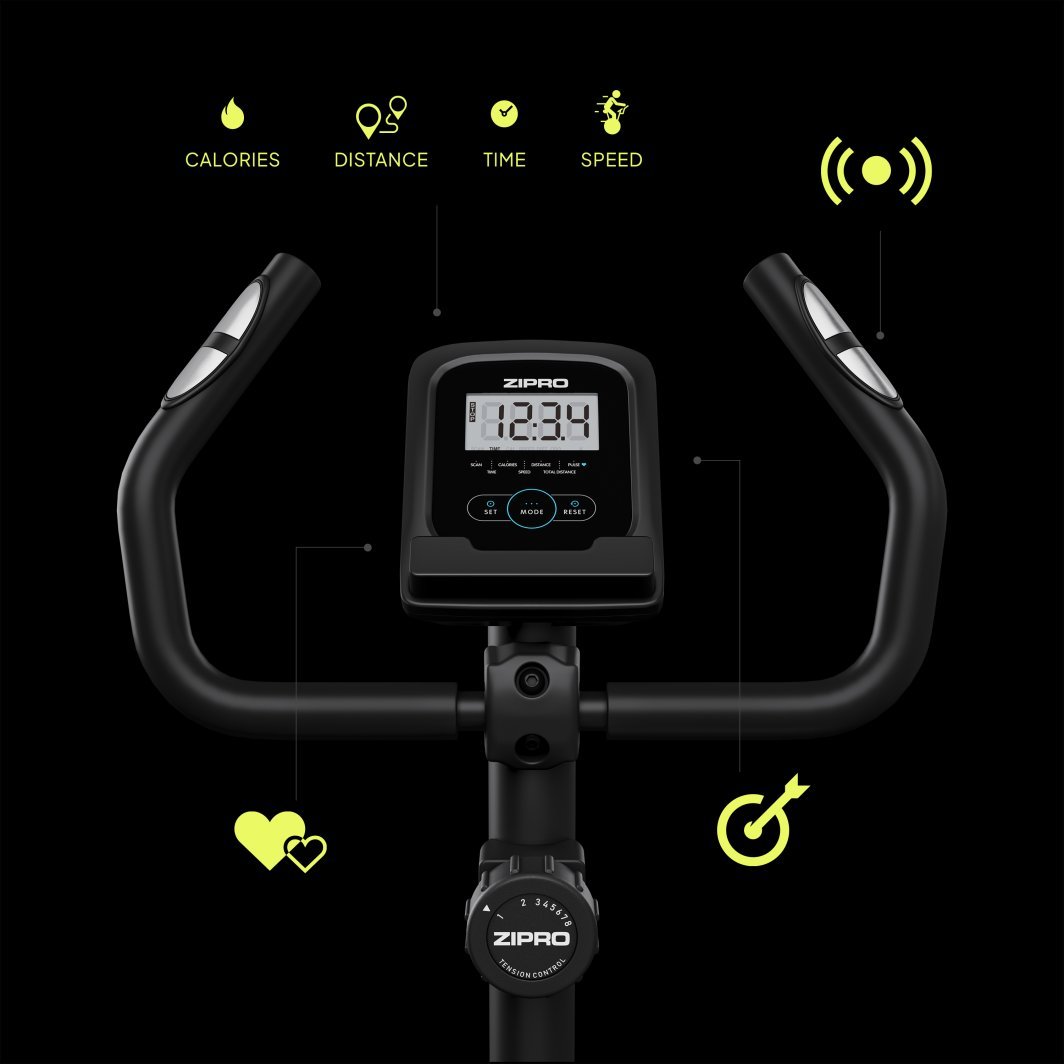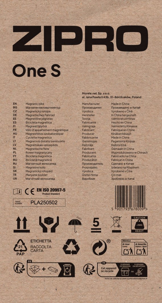 ZIPRO One S Domowy trening, który jest przyjemnością One S to bestsellerowy rowerek stacjonarny ZIPRO przeznaczony do treningu prowadzonego w warunkach domowych. Oferuje niczym nieograniczone możliwości dostępu do treningów, dlatego w każdej chwili możesz zażyć dawki ruchu, która pozytywnie wpłynie na kondycję oraz pozwoli wyszczuplać sylwetkę i spalać nadmiar kilogramów. Połączenie klasycznej i eleganckiej czerni z niebieską łezką sprawi, że One S stanie się nie tylko ulubionym przyrządem do ćwiczeń, ale również ozdobą Twojego mieszkania. Miej swój trening pod kontrolą One S został wyposażony komputer z czytelny ekranem i półką na urządzenie mobilne, która pozwala ci mieć pod ręką smartfona, by być cały czas online. 3 funkcyjne przyciski zapewniają łatwą obsługę. Wyświetlacz komputera informuje o: czasie ćwiczeń, przebytym dystansie, liczbie spalonych kalorii, aktualnej prędkości, wysokości pulsu rejestrowanej za pomocą dotykowych czujników do pomiaru tętna umieszczonych na uchwytach kierownicy. Funkcja SCAN prezentuje kolejno wszystkie mierzone dane – dzięki temu komputer rowerka obrazuje pełne informacje bez konieczności wciskania przycisków i odrywania rąk od kierownicy. By baterie działały dłużej, komputer po kilku minutach bezczynności automatycznie się wyłącza. Trenuj mocniej Maksymalna waga użytkownika wynosi 110 kg. Stabilizatory dbają o zachowanie stabilności w trakcie ćwiczeń, a ich wykończenie nakładkami z tworzywa zabezpiecza podłoże przed zarysowaniem. Usiądź wygodnie Siodełko z miękkim wypełnieniem zapewnia wygodę podczas jazdy. Jego regulacja wysokości pozwala na dokładne dopasowanie do wzrostu osoby ćwiczącej. Ćwicz komfortowo Pedały posiadają antypoślizgową powierzchnię i regulowane paski dla stabilizacji stóp podczas ćwiczeń. Na tylnym stabilizatorze znajdują się obrotowe nakładki, które umożliwiają wypoziomowanie rowerka. Doskonały w każdym detalu Rower ma zgrabną sylwetkę i został wykonany z dbałością o szczegóły. Staranne wykończenie gwarantuje trwałość i długą żywotność. Oferujący zróżnicowane poziomy treningu Niezależnie od ustawionego stopnia oporu, mechanizm działa cicho, płynnie bez zrywów i charakteryzuje się bezawaryjnością. Stworzony do ćwiczeń w domu Ergonomiczna konstrukcja i stosunkowo niewielkie wymiary rowerka sprawiają, że znakomicie sprawdza się w pomieszczeniach o ograniczonej przestrzeni. Wygodna manualna regulacja Zarządzanie oporem magnetycznym odbywa się z użyciem pokrętła umieszczonego na kolumnie kierownicy. 8 poziomów jego regulacji pozwala dostosować obciążenie do stopnia wytrenowania osoby ćwiczącej i do indywidualnych potrzeb. Idealny do domowego treningu Rower stacjonarny jest jednym z najpopularniejszych urządzeń typu cardio wybieranych do treningu domowego. Nie zajmuje wiele miejsca i pozwala prowadzić skuteczny trening we własnych czterech ścianach. Przesuwanie rowera jest proste i wygodne dzięki rolkom transportowym, umieszczonym na przedniej podstawie. Pracuj nad kondycją i wyglądem Trening z użyciem rowerów treningowych pozwala wydajnie spalać kalorie i pozbywać się nadmiaru tkanki tłuszczowej. Po zaledwie 30 minutach pracy z rowerkiem organizm spala nawet ponad 200 kcal. Ćwiczenia umożliwiają poprawę swojego wyglądu i szybko można dostrzec zauważalne różnice w postaci wyszczuplonych i wyrzeźbionych nóg, pośladków oraz bioder. Ćwiczenia na nim angażują do pracy przede wszystkim mięśnie nóg. Najintensywniej podczas jazdy pracują dwugłowe i czworogłowe ud, łydki oraz pośladki, a także mięśnie brzucha i ramion. Dużą zaletą rowerków jest to, że nie obciążają stawów i kręgosłupa ciężarem własnego ciała, dlatego korzystanie z nich jest bezpieczne. Wybierając rower Zipro One S otrzymujesz: Nowoczesne urządzenie fitness tylko dla siebie Możliwość treningu niezależnie od godzin otwarcia siłowni Jakość i bezpieczeństwo potwierdzone normą DIN EN 957-1/5 Profesjonalny serwis ze stałym dostępem do części zamiennych Dane techniczne: Maksymalna waga użytkownika: 110 kg Optymalny wzrost użytkownika: 140-165 cm Wymiary (długość×szerokość×wysokość): 89,7×43,5×110 cm Waga: 15,5 kg System oporu: magnetyczny system oporu regulacja manualna (8 poziomów) waga systemu koła zamachowego: 4,5 kg Kierownica: odległość kierownicy od siodełka: 39,5 cm (odległość mierzona jest przy maksymalnej wysokości siodełka, od jego początku do wspornika kierownicy) sensory pulsu w uchytach kierownicy Siodełko: regulacja wysokości (od ziemi): 65-80 cm regulacja wysokości (od pedałów): 55-75 cm ilość poziomów regulacji: 5 wygodne siodełko z pianki EVA Stabilizatory: szerokość: przedni 38,5 cm, tylni 43,5 cm rolki transportowe w przednim stabilizatorze nakładki poziomujące w tylnim stabilizatorze Inne: antypoślizgowe, samopoziomujące pedały z regulowanymi paskami półeczka na urządzenie mobilne Wymiary transportowe: 595×255×475 mm / 17 kg Specyfikacja komputera: Wyświetlacz LCD Zasilanie: baterie 2×AAA Pomiar: czas, prędkość, kalorie, dystans, całkowity dystans (ODO), puls Funkcje: SCAN – cykliczne wyświetlanie parametrów treningu odliczanie ustawionej wartości (czasu, dystansu, ilość kalorii) ostrzeżenie o przekroczeniu ustawionej wartości pulsu (z alarmem) Pulse Rate oszczędzanie energii – wyłączenie po 4 minutach bezczynności