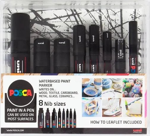 Posca Uni Paint Marker Pens in Black – Набір із 8 предметів Вміст набору У набір входять чорні маркери з такими розмірами наконечників: Специфікація PCF-350 – Наконечник пензля (1-10 мм) PC-1MR – Надзвичайно тонкий наконечник (0,7 мм) PC-1M – Надзвичайно тонкий наконечник (0,7 мм) PC-3M – Наконечник кулі (0,9 – 1,3 мм) PC-5M – Наконечник кулі середнього розміру (1,8-2,5 мм) PC-7M – Кульовий наконечник (4,5-5,5 мм) PC-8K – Наконечник долота (8 мм) PC-17K – Надширокий наконечник (15 мм)