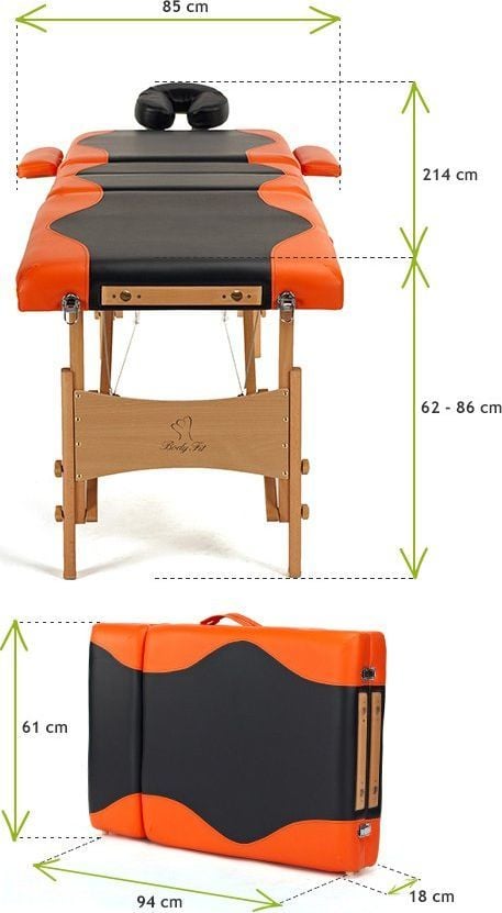 4-х сегментне масажне ліжко BodyFit забезпечує високий комфорт і зручність роботи людям, які проходять різні процедури.Підйомна, 10-ступінчаста, регульована панель дозволяє встановити стіл в положення лежачи або сидячи.Легке регулювання висоти в діапазоні 62-86 см дозволить вам адаптувати його до ваших потреб миттєво.Корисна поверхня покрита екологічною шкірою, під якою знаходиться густий поролон, що забезпечує м’якість.Для підвищення комфорту ліжко оснащене функціональними аксесуарами, такими як: додаткова піднята панель під ноги, бічні підлокітники, що додають кілька додаткових сантиметрів до ширини столу, передній підлокітник, який забезпечує більший доступ до рук, дає можливість відпочити рукам, регульований підголівник у формі підкови, кишені для косметики, які завжди будуть під рукою, вішалка для рушників, додатковий отвір для обличчя в стільниці.Ліжко разом з аксесуарами, які поміщаються всередині, складається у валізу, що закривається на пряжки.Ми складаємо все в транспортний чохол, що входить в комплект, завдяки чому ми можемо комфортно пересуватися.Чохол додатково оснащений плечовим ременем і місцем для масажного ролика.Наші масажні ліжка мають відповідні сертифікати, що підтверджують їх якість і відповідність директивам щодо виробів медичного призначення.загальна довжина столу: 188,0 см загальна довжина столу з підголівником: 214,0 см загальна ширина: 61,0 см загальна ширина з підлокітниками: 85,0 см довжина підлокітника: 39,0 см регульована висота: 62,0 – 86,0 см довжина підйомної панелі: 71,0 см довжина складеного ліжка: 94,0 см ширина складеного ліжка: 18,0 см висота складеного ліжка: 61,0 см