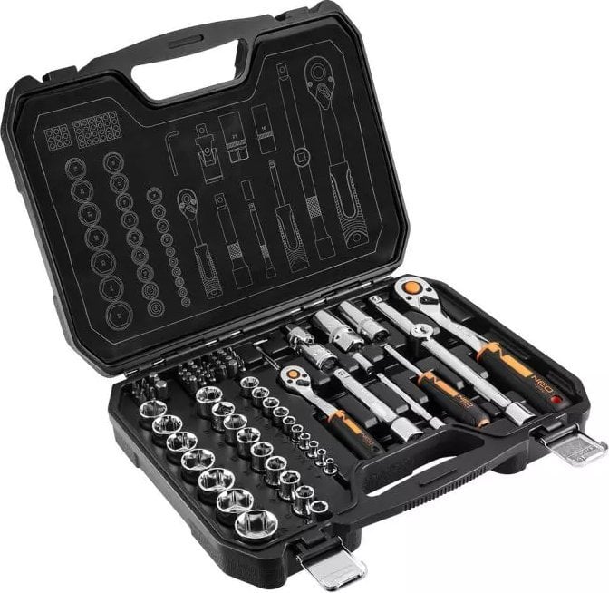 Торцеві ключі 1/2″, 1/4″, набір із 73 предметів, CrV (10-054) Універсальний набір високоякісних торцевих ключів ½” та ¼”, що містить 73 інструменти та аксесуари від бренду NEO.Продукція представлена в практичному пластиковому кейсі з металевими засувками і зручною ручкою.Крім того, всередині упаковки вистелена спеціальна вставка, яка допомагає зберігати речі в порядку та захищає вміст від пошкоджень.Набір складається з: тріскачок ½” і ¼” (покращені версії, оснащені точним храповим механізмом на 90 зубів, з вигнутими та ергономічними ручками), 16 шт. шестигранних гнізд ½” розміром від 10 до 27 мм, 10 шт. шестигранних гнізд ¼” розміром від 4 до 13 мм, 33 шт.30 біт мм плоский, перехресний і шестикутний – TX8, TX10, TX15, TX20, TX25, TX27, TX30, TX40, PH0, PH1, PH2, PH3, PZ1, PZ2, PZ3, SL4, SL5.5, SL7, H3, H4, H5, H6, H8, H10, H1/8″, H9/64″, H5/32″, H3/16″, H7/32″, H1/4″, H 5/16″, SPLINE 6, 8, ключі шестигранні 3 шт., а також комплектуючі – кардан ½”, подовжувач ½” – дві штуки на 125 мм і 250 мм, дві свічкові головки ½” – 16 мм і 21 мм, перехідник.з отвором, ручка ¼”, тримач біта ¼”, ручка з приводом 150 мм і подовжувачем ¼” 100 мм. Інструменти виготовлені з високоякісної хром-ванадієвої сталі. Тріскачки також оснащені рукояткою з двох матеріалів, яка є частиною нового дизайну ручки – ще зручніше у використанні. Використовується для закручування та відкручування гвинтів, для використання в майстернях і сервісних центрах, для професіоналів. Особливості продукту: набір з 73 торцевих ключів, якісний, новий дизайн ручки, практичний кейс для зберігання та транспортування набору, 25-річна гарантія, сертифікат TÜV Rheinland M+T. шестигранні ключі (1,5, 2, 2,5 мм), 1x ½” універсальний шарнір, 2x ½” подовжувачі – розміром 125 мм і 250 мм, 2x ½” свічкові головки – 16 мм і 21 мм, 1x адаптер з отвором, 1x ¼” тримач, 1x ¼” тримач для насадок, 1x ручка з приводом 150 мм, 1x ¼” подовжувач 100 мм, пластиковий корпус.