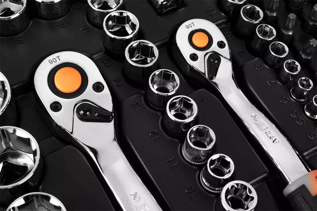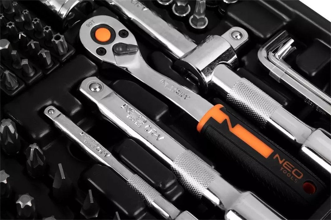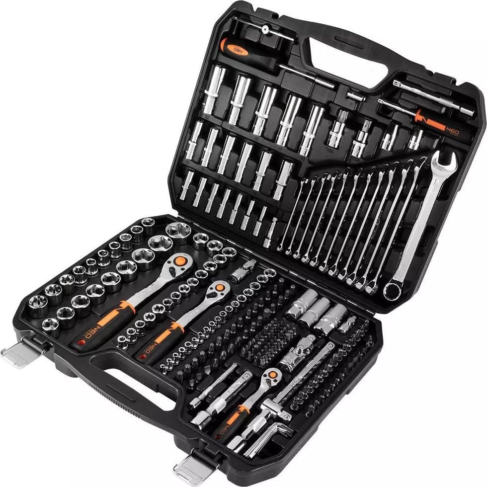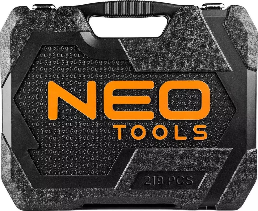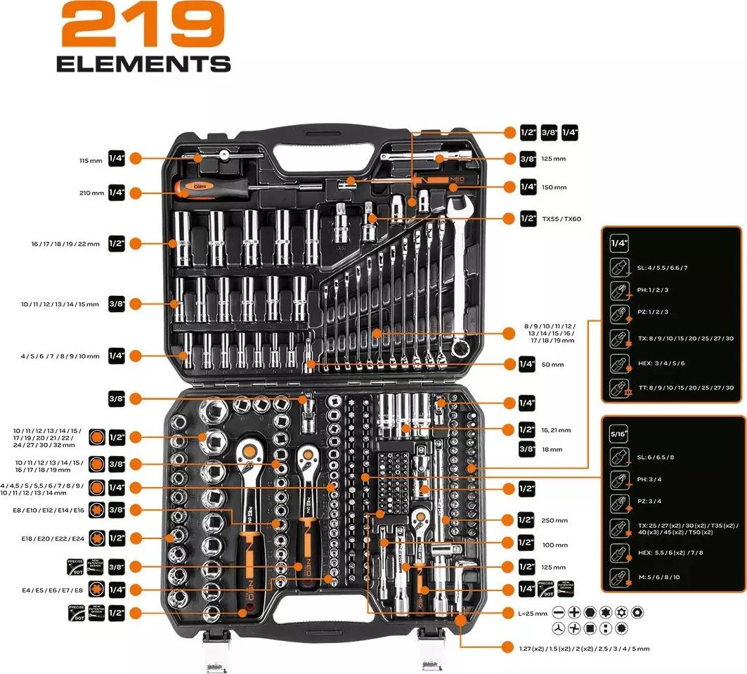 Набір торцевих ключів 1/2″, 3/8″, 1/4″, 219, CrV (10-076) Повний набір високоякісних торцевих ключів ½”, ¼” і 3/8, що містить цілих 219 інструментів і аксесуарів від бренду NEO. Вироби пропонуються в практичному пластиковому футлярі, з металевими засувками та зручною ручкою. Крім того, всередині упаковки є підкладка. зі спеціальною вставкою, яка дозволяє підтримувати порядок і захищає вміст від пошкоджень. Набір складається з: ½”, ¼” і 3/8 тріскачок (з 90 зубцями, з вигнутими і ергономічними ручками і 5-градусним поворотом тріскачки), 15 шт. ½” шестигранних гнізд розміром від 10 до 32 мм, 5 шт. головки ½” розміром від 16 до 22 мм, 4 шт. головки E ½” розміром від E18 до E24, 10 шт. шестигранної головки 3/8″ розміром від 10 до 19 мм, 6 шт. довгих шестигранної головки розміром від 10 до 15 мм, 5 шт. головки E 3/8″ розміром від E8 до E16, 13 шт. головок ¼” шестигранних розмірів від 4 до 14 мм, 7 шт. довгих ¼” шестигранних головок розмірів від 4 до 10 мм, 5 шт. E ¼” головок розмірів від E4 до E8, 10 шт. шестигранних ключів, 12 шт. Біти ¼”, 30 біт 30 мм і багато додаткових аксесуарів.Інструменти виготовлені з високоякісної хромованадієвої сталі.Деякі також оснащені ручкою з двох матеріалів, яка є частиною нового дизайну ручки – ще більш зручною у використанні.Найважливіша інформація Використовуйте для загвинчування та викручування шурупів, для використання в майстернях і сервісних центрах, для професіоналів.Характеристики товару: набір торцевих ключів 219, якісний, міцний, новий дизайн ручки, практична валіза для зберігання та транспортування набору, гарантія 25 років, сертифікат TÜV Rheinland M+T.Матеріал хромованадієва сталь, ручка з двох матеріалів.У набір входить 1x тріскачка ½”, 90 зубів, стрибок собачки на 5 градусів, 1x тріскачка ¼”, 90 зубів, тріскачка на 5 градусів, 1x тріскачка 3/8″, 90 зубів, стрибок собачки на 5 градусів, 15x ½”, шестигранні головки, 5x головок ½”, довгі шестигранні головки, 4x E ½”, 5x E 3/8″, 5x E ¼”, 10x 3/8″ шестигранні головки, 6x довгі шестигранні головки, 13x ¼” шестигранні головки, 7x ¼” довгі шестигранні головки, 10x шестигранні ключі, 12x гайкові ключі з плоским отвором, 30x ¼” головки з насадкою, 30x 30 мм насадки, аксесуари: 2x ½” свічкові головки – 16 мм і 21 мм, 2x ½” подовжувачі – 125 мм і 250 мм, 1x ½” кардан, 1x адаптер з отвором ½”, 1x розетка з ½” насадкою T55, T60, 1x насадка тримач ½”, 5/16″, 1x гніздо для свічки 3/8″ 18 мм, 1x подовжувач 3/8″ 125 мм, 1x карданний шарнір 3/8″, 1x тримач біт 3/8″, 5.16″, 1x подовжувач ¼” 100 мм, 1x подовжувач ¼” 50 мм, 1x карданний шарнір ¼”, 1x ручка 115 мм, 1x тримач для біт ¼”, 1x тримач для викрутки ¼”, 1x ручка з колектором ¼”, 1x ручка 65 мм, пластиковий кейс.