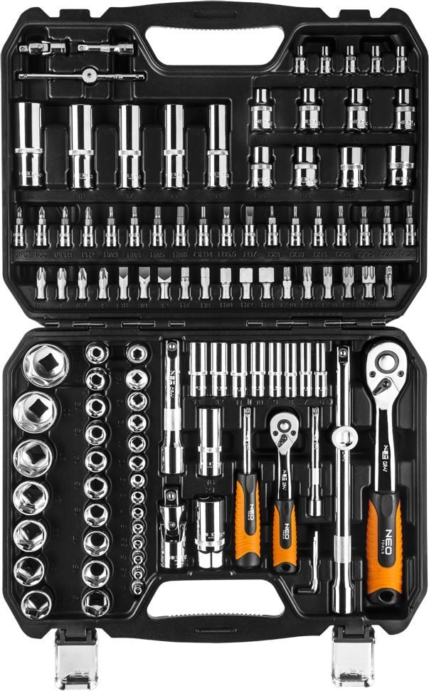 Набір торцевих ключів 1/4″ 1/2″ 110 шт.(08-666) Практичний набір торцевих ключів NEO у зручній валізі.Набір містить 110 елементів, включаючи тріскачки 1/2″ і 1/4″ з ергономічною формою ручок, а також набір шестигранних головок, головок Torx, насадок для викрутки та додаткових аксесуарів.Все це зроблено з високоякісної хром-ванадієвої сталі, що робить ці інструменти не тільки корисними, але й дуже міцними.Набір із 110 елементів у практичній валізі. Незалежно від того, займаєтеся ви своїми руками професійно та користуєтеся торцевими гайковими ключами щодня на роботі, чи, можливо, використовуєте їх лише час від часу, коли вам потрібно зробити якусь дрібну роботу вдома чи на машині.Набір із 110 елементів NEO у практичній валізі — чудовий вибір — усі елементи впорядковані та розміщені на своїх місцях, що значно спрощує вибір необхідних інструментів та підтримку їх у ідеальному технічному стані.Замість того, щоб шукати потрібний ключ у скриньці чи ящику, просто потягніться до ручки та обраного наконечника.Валіза також полегшує безпечне зберігання набору та комфортне його перенесення.Зручність використання та ергономічність гарантовані. Торцеві ключі надзвичайно зручні та практичні у використанні.Замість того, щоб мати набір окремих гайкових ключів і викруток, просто дотягніться до ручки та виберіть відповідний наконечник.Такий набір займає мало місця, а практична валіза дозволяє легко тримати всі елементи в порядку та справному технічному стані.У набір входять ергономічні ручки, які полегшують використання інструментів навіть у тісних і важкодоступних місцях. Гарантія до 25 років.Найвищу якість виготовлення та довговічність інструментів NEO підтверджує сертифікат TÜV Rheinland M+T та гарантія терміном до 25 років.Потягніться до інструментів, які будуть повністю працездатними та функціональними не лише відразу після покупки, але й протягом багатьох років.Це чудова інвестиція в набір, який стане в нагоді в багатьох випадках, як любителям DIY, так і досвідченим професіоналам.Інструменти торгової марки NEO користуються захопленням завдяки високій якості та доступній ціні.