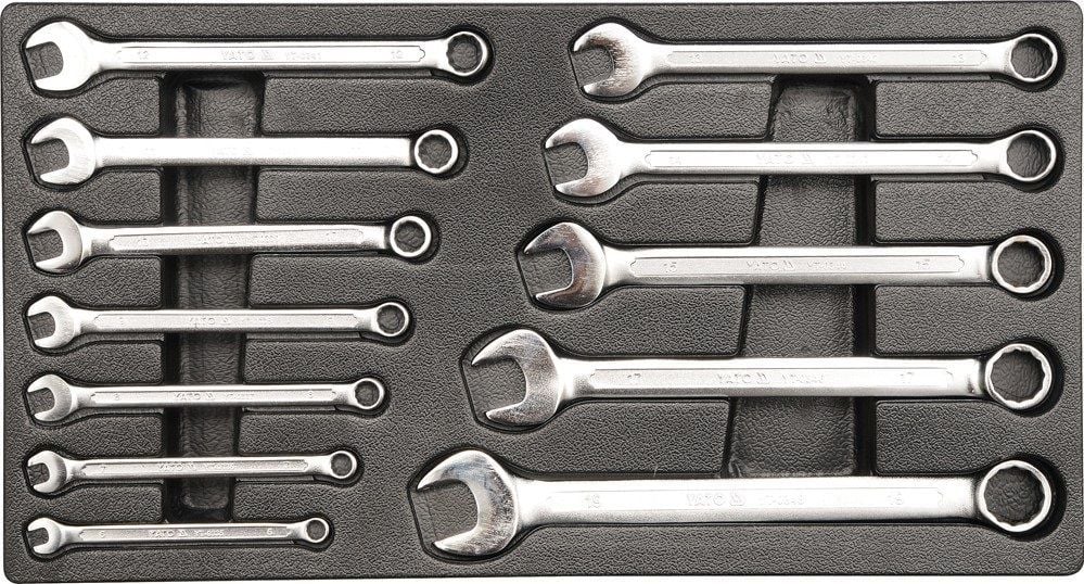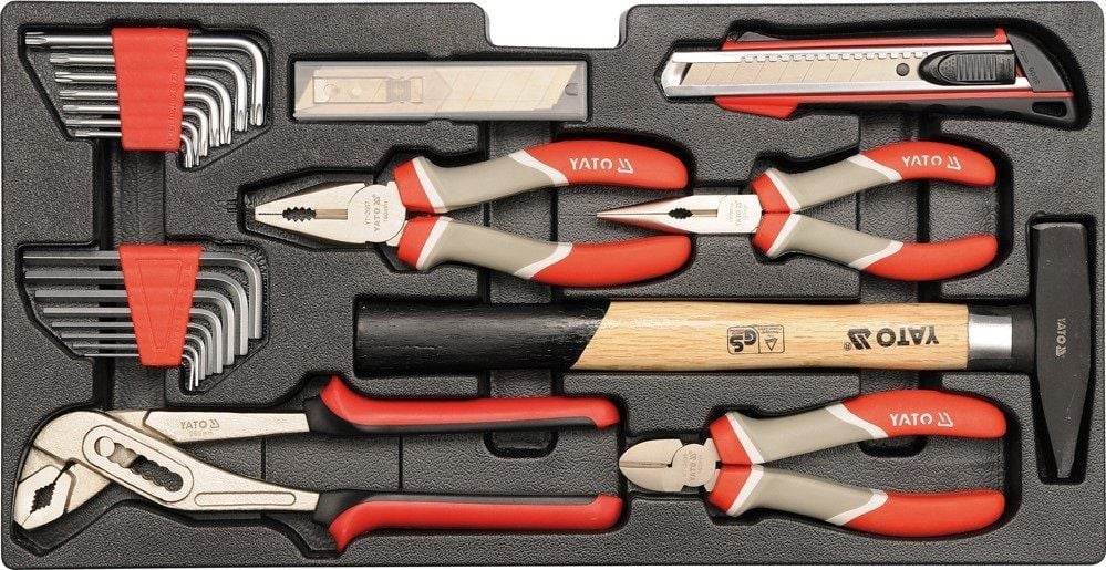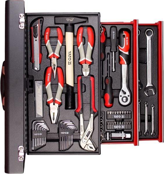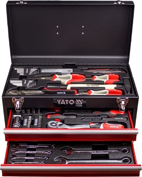 Ящик для інструментів 80 шт.YT-38951 Опис товару: Ящик для інструментів марки Yato.Містить 80 шт.найбільш часто використовувані ручні інструменти, корисні для підтримки руху у виробничому цеху для незначних робіт у механічній майстерні чи гаражі.Ящик виготовлений з оцинкованого металу 0,6 мм.Розетки з міцної інструментальної сталі CrV 50BV30.Тріскачка має 72 зуба, виготовлена зі сталі CrV 6140, а насадки виготовлені зі сталі AISI S2.Призначення/застосування: Промисловість, сервісне обслуговування Вміст пакету: – Головки 1/2″: 10, 11, 12, 13, 14, 15, 17, 19 мм, L= 38 мм – Головки 1/4″: 5, 6, 7, 8, 9, 10, 11, 12, 13 мм, L= 25 мм – Candle головка 1/2″, 21 мм – тріскачка 1/2″, 72T, L= 255 мм – Викрутка для 1/4″, L= 150 мм – тримач 1/4″ для біт 1/4″ – плоскі насадки 1/4″: 3 мм (2 шт.), 4 мм (2 шт.), 5 мм (2 шт.), 5,5 мм (2 шт.), 6 мм (2шт.) довжина L= 25мм – 1/4″ біти, PHILIPS: PH0, PH1 (2шт.), PH2 (2шт.), PH3 довжина L= 25мм – 1/4″ біти, POZIDRIVE: PZ0, PZ1 (2шт.), PZ2 довжина L= 25мм – Плоскі викрутки: 5×75мм, 6×100 мм, 8×150 мм – Викрутки PHILIPS: PH1x75 мм, PH2x100 мм – Ключі комбіновані: 6, 7, 8, 9, 10, 11, 12, 13, 14, 15, 17, 19 мм – Шестигранні ключі: 1,5, 2, 2,5, 3, 4, 5, 5,5, 6 мм – Головки шестигранні TORX: T10, T15, T20, T25, T27, T30, T40 – Кліщі фіксуючі 180 мм – Кліщі бічні 160 мм – Плоскогубці подовжені прямі 160 мм – Кліщі гідравлічні регульовані 250 мм – Слюсарний молоток 300 г – Ніж з ламаючим лезом SK2 18 мм – Запасні леза для ножа з ламаючим лезом 18 мм SK2