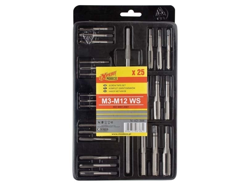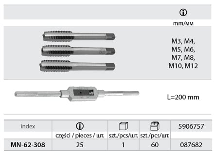 Набір мітчиків М3-М12 25 шт.MN-62-308 Набір мітчиків з високоякісної швидковисихаючої сталі WS Z, 25 елементів, упакований у зручну валізу Дозволяє підтримувати порядок і зручно транспортувати В комплекті: мітчики G розмірів M3, M4, M5, M6, M7, M8, M10, M12 Регульована ручка для мітчиків довжиною 200 мм.