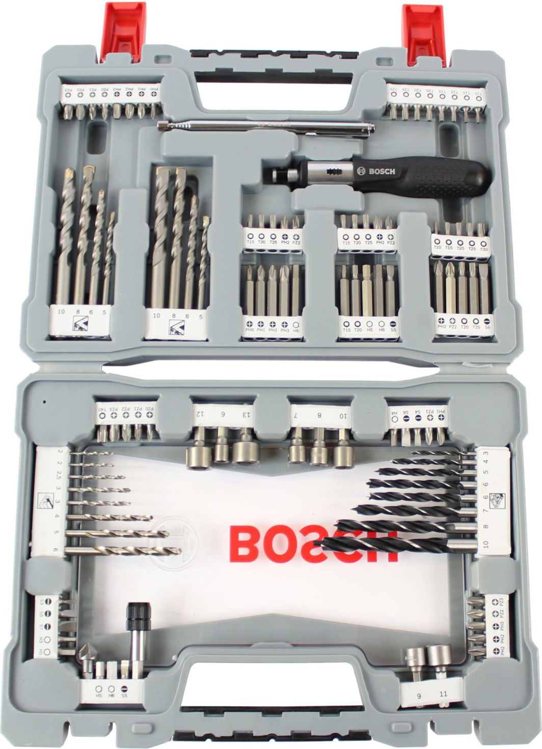 Набір свердел і насадок Bosch, містить 105 деталей.Розміри: 320 x 75 x 235 мм.Обладнання: Ручна викрутка Магнітна рейка 8 свердел по бетону: 2×5, 2×6, 2×8, 2×10 мм 8 свердел по металу HSS-G: 2×2, 2,5, 2×3, 4, 5, 6 мм 8 свердел по дереву: 3, 4, 5, 2×6, 7, 8, 10 мм 8 гніздових гайкові ключі: 6, 7, 8, 9, 10, 11, 12, 13 мм 15 насадок для викрутки (50 мм): PH0, PH1, 2xPH2, PH3, PZ2, S5, S6, T15, 2xT20, T25, H5, 2xH6 54 насадки для викрутки (25 мм): PH0, 2xPH1, 5xPH2, 2xPH3, 2xPZ0, 3xPZ1, 5xPZ2, 3xPZ3, S3, S4, 2xS5, S6, S7, 3xT10, 5xT15, 5xT20, 5xT25, T30, T40, H3, H4, 2xH5, H6 Швидка зміна тримач універсальний, магнітний зенкер