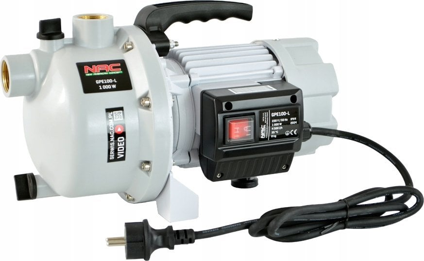 NAC GARDEN PUMP 1000W 4400l/h – Ефективність і надійність у вашому саду Садовий насос NAC GPE100-L є чудовим рішенням для тих, хто хоче доглядати за своїм садом.Завдяки потужності 1000 Вт і продуктивності 4500 літрів на годину цей пристрій забезпечує ефективне і швидке перекачування води, що робить його ідеальним інструментом для зрошення і поливу.Електронасос для перекачування води. Насос NAC GPE100-L – це електричний пристрій, який поєднує в собі потужність і функціональність.Працює від мережі 230 В, він простий у використанні і не вимагає складної установки.Завдяки сучасним технологіям насос не тільки ефективний, але й безпечний у використанні.Висока продуктивність – 4500 літрів на годину Однією з найважливіших переваг насоса NAC GPE100-L є його вражаюча ефективність.З максимальною продуктивністю 4500 літрів на годину насос ідеально підходить для різноманітних застосувань, від поливу садів до роботи зрошувальних систем.Максимальний робочий тиск до 2,8 бар Насос забезпечує максимальний робочий тиск 2,8 бар, що дозволяє ефективно перекачувати воду на велику висоту.Це дозволяє користувачам використовувати пристрій у різних умовах, незалежно від вимог тиску.Зручна ручка для перенесення та стійка основа. Насос був розроблений з урахуванням зручності користувача.Оснащений практичною ручкою для перенесення і міцною основою, він забезпечує стабільність під час роботи, що важливо в разі тривалого використання.Використання в домашньому господарстві та садівництві NAC GPE100-L – це універсальний пристрій, який можна використовувати як в домашньому господарстві, так і в садівництві.Він ідеально підходить для поливу рослин, наповнення резервуарів для води та роботи зрошувальних систем.Завдяки глибині всмоктування до 8 метрів насос можна використовувати в різних умовах місцевості.Детальні технічні параметри насоса NAC GPE100-L Модель пристрою: GPE100-L Тип насоса: електродвигун Потужність: 1000 Вт Напруга живлення: 230 В Максимальна продуктивність: 4500 л/год Максимальний робочий тиск: 2,8 бар Максимальна висота нагнітання: 45 метрів Максимальна глибина всмоктування: 8 метрів Максимальна температура рідини: 35 градусів Цельсія Шланг діаметр входу та випуску: 1 дюйм Вага насоса: 8 кг Виробник: NAC Замовляйте зараз, щоб насолоджуватися найкращою продуктивністю у своєму саду!Ідеально підходить для ваших потреб – доступний сьогодні в Morele!