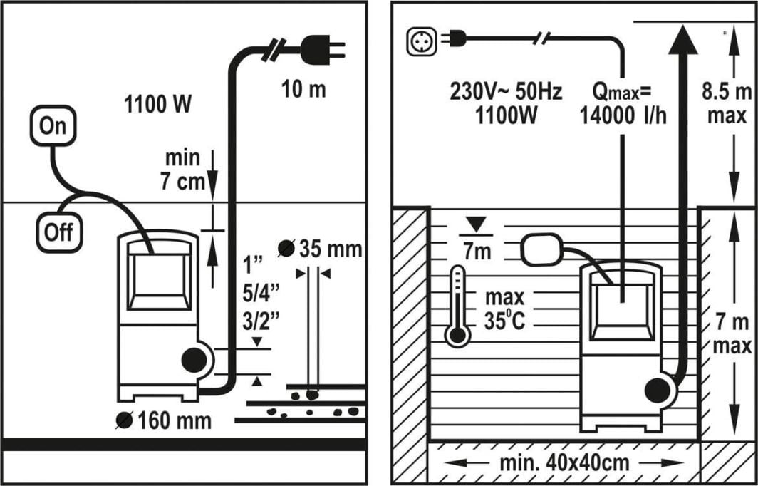 Насос для брудної води FLO 1100W (79775) Технічні дані Максимальна висота підйому [м]: 8,5 Максимальна глибина занурення [м]: 7 Вага нетто [кг]: 4,1 Ступінь захисту [IP]: IP X8 Максимальна продуктивність [дм3/год]: 16000 Довжина кабелю [м]: 10 Діаметр підключення: G1, G5/4, G3/2 Поплавковий вимикач: ТАК Максимальний діаметр бруду [мм]: 35 Потужність [Вт]: 1100